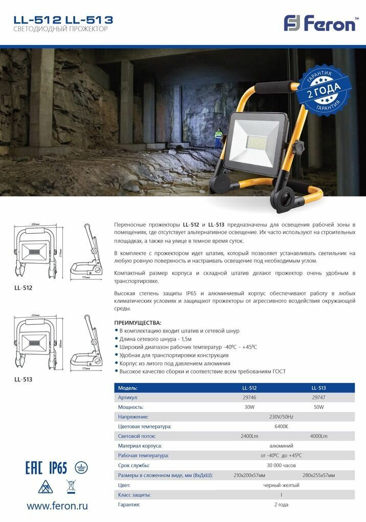 Прожектор светодиодный LL-513 50Вт 6400K 78*SMD2835 4000Лм переносной IP65 Feron