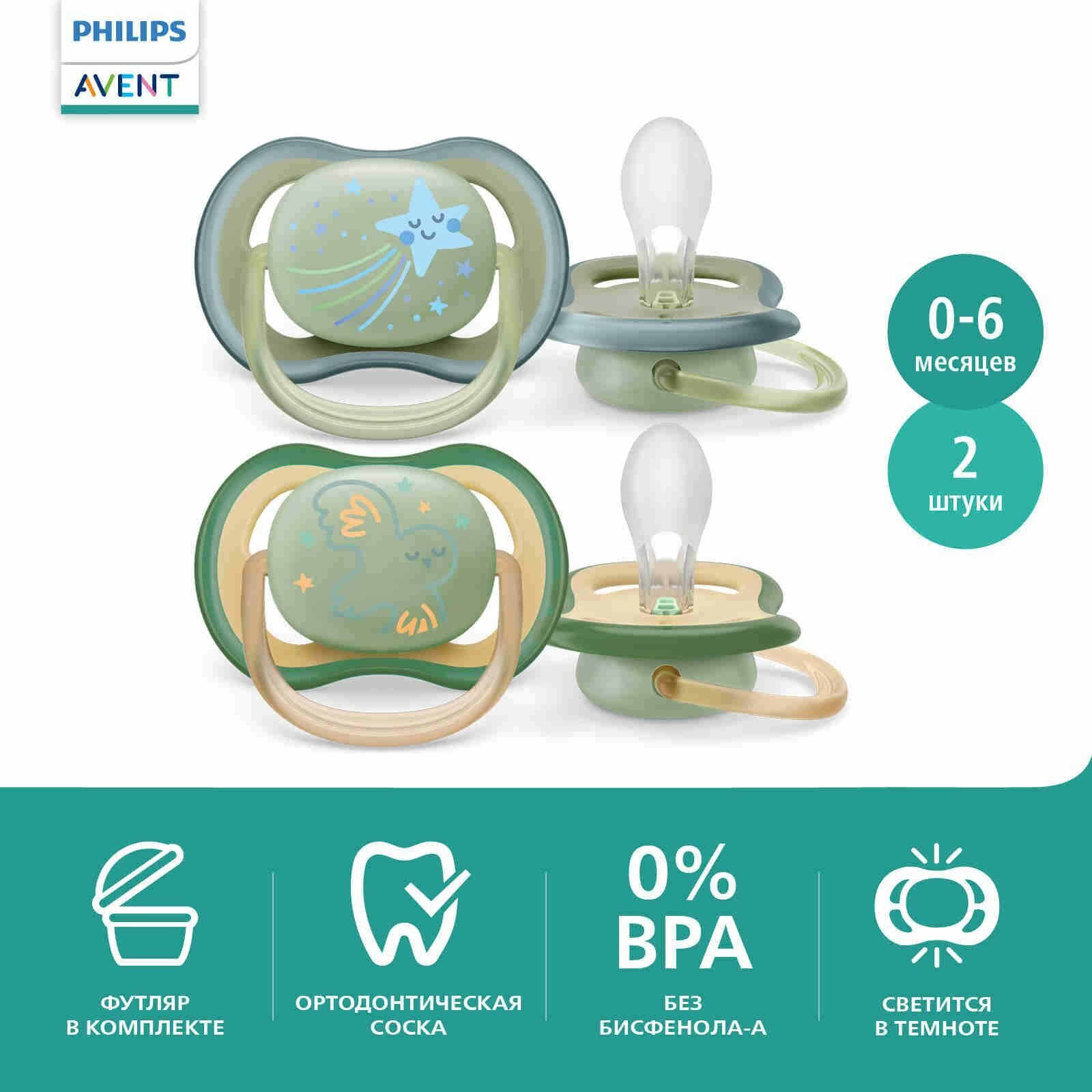 Светящаяся соска-пустышка Philips Avent ultra air night SCF376/01 силиконовая, с футляром для хранения и стерилизации, 18 мес +, 2 шт