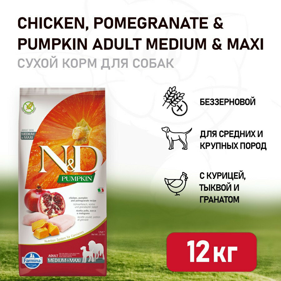 Farmina N&D Pumpkin Dog Grain Free Chicken & Pomegranate Adult Medium & Maxi сухой беззерновой корм для взрослых собак средних и крупных пород с курицей, гранатом и тыквой - 12 кг