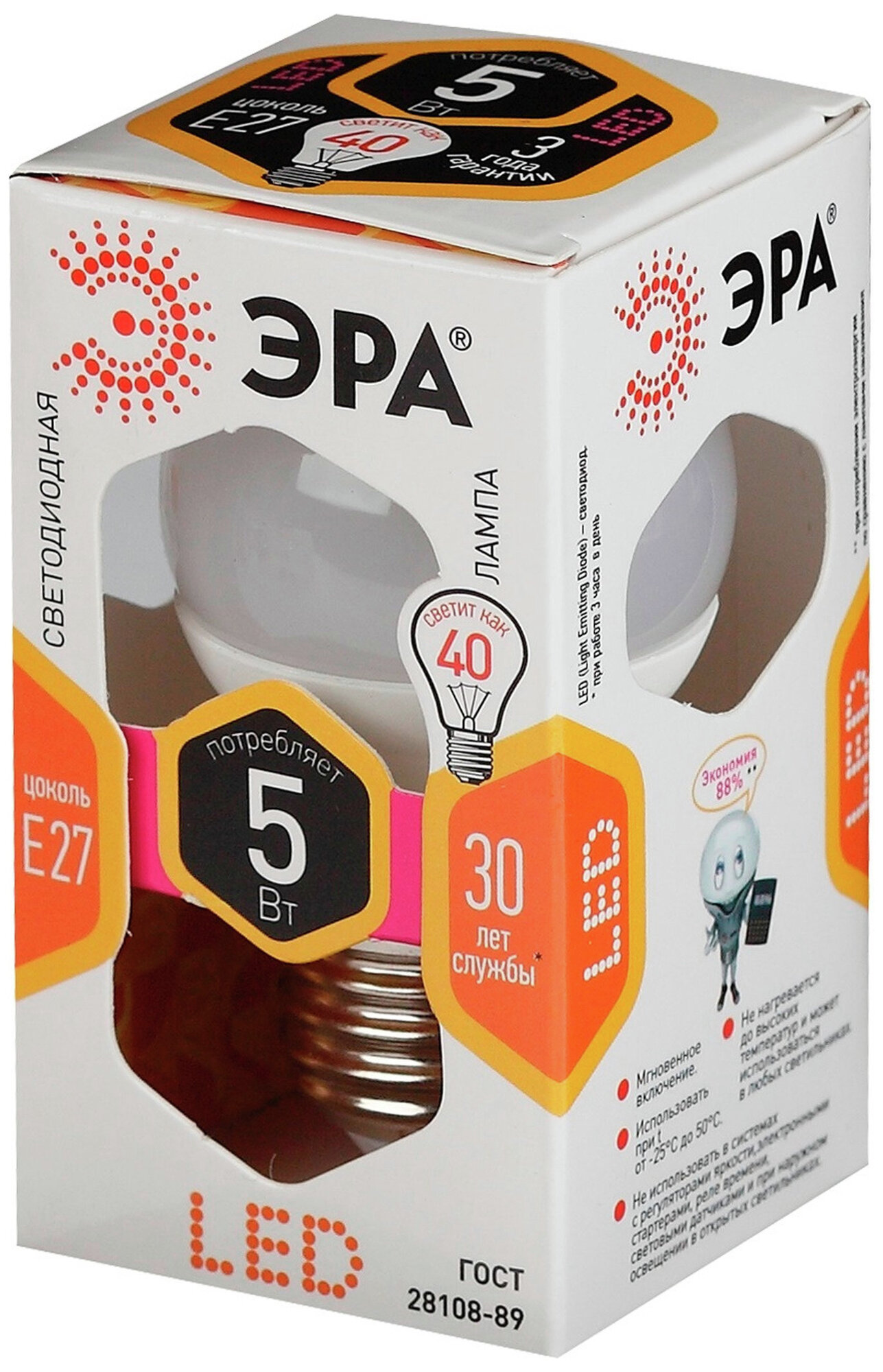 ЭРА стандарт шар P45 E27 5W(400lm) 2700K 2K 80x45 P45-5W-827-E27 6765 (арт. 656777)
