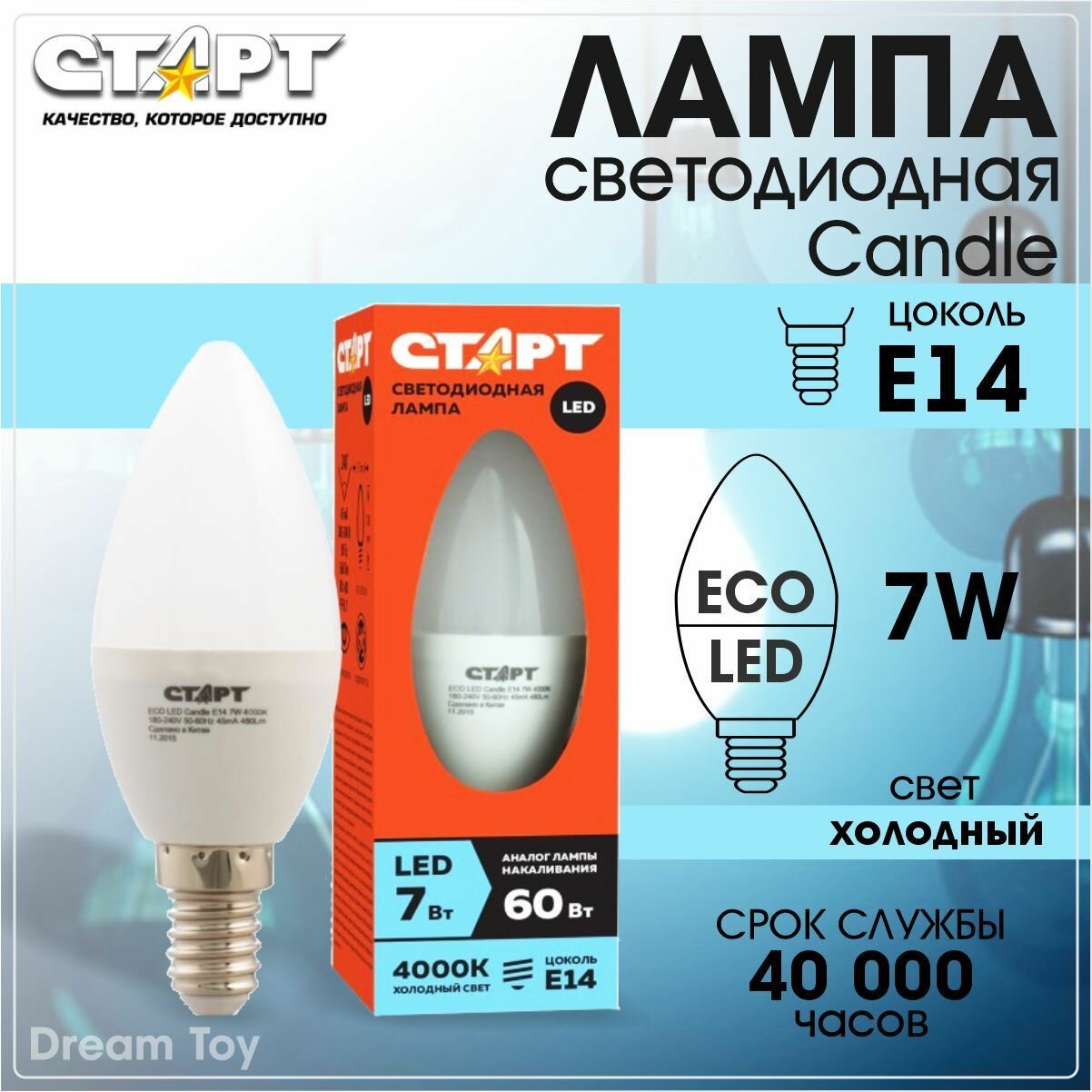 Лампа светодиодная Старт LED, серия ЭКО 7W40, тип С свеча, E14, 4000К, холодный свет, 15000 ч
