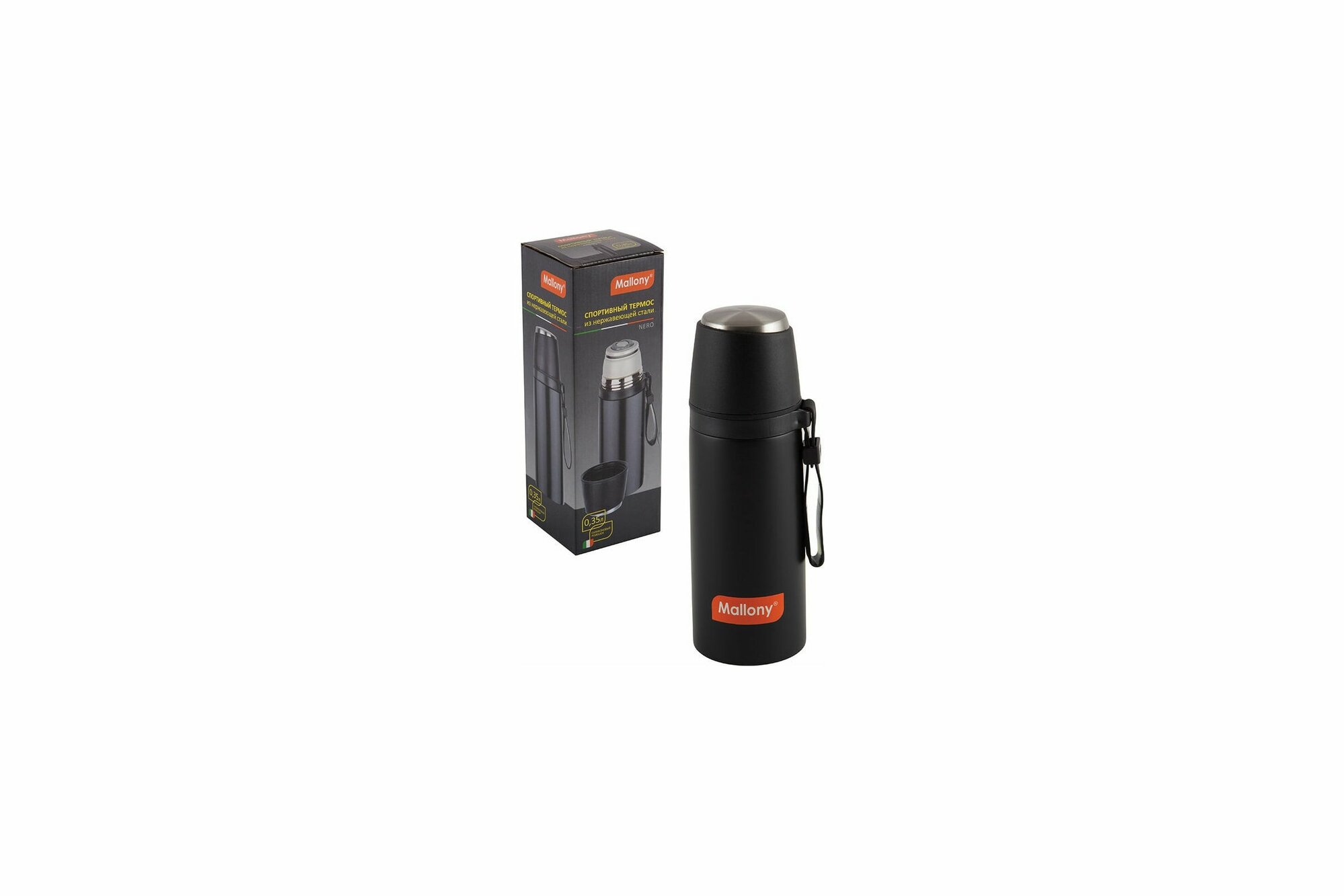 Термос спортивный Mallony NERO, 0,35 л, с чашкой и силиконовым ремешком для переноски