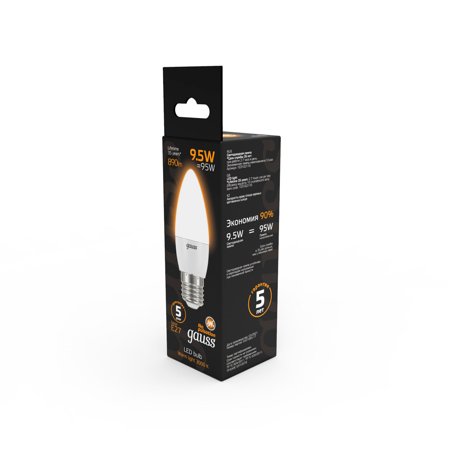 Упаковка ламп LED GAUSS E27, свеча, 9.5Вт, 3000К, белый теплый, 10 шт. [103102110]