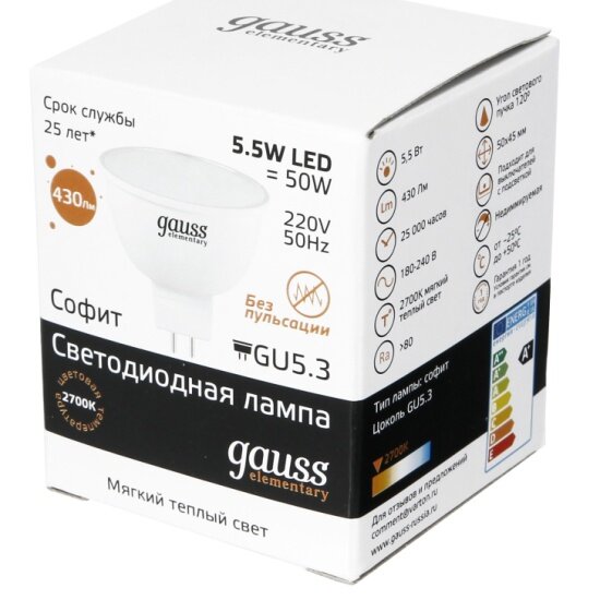 Лампа светодиодная gauss Elementary 13526, GU5.3, MR16, 5.5 Вт, 4100 К