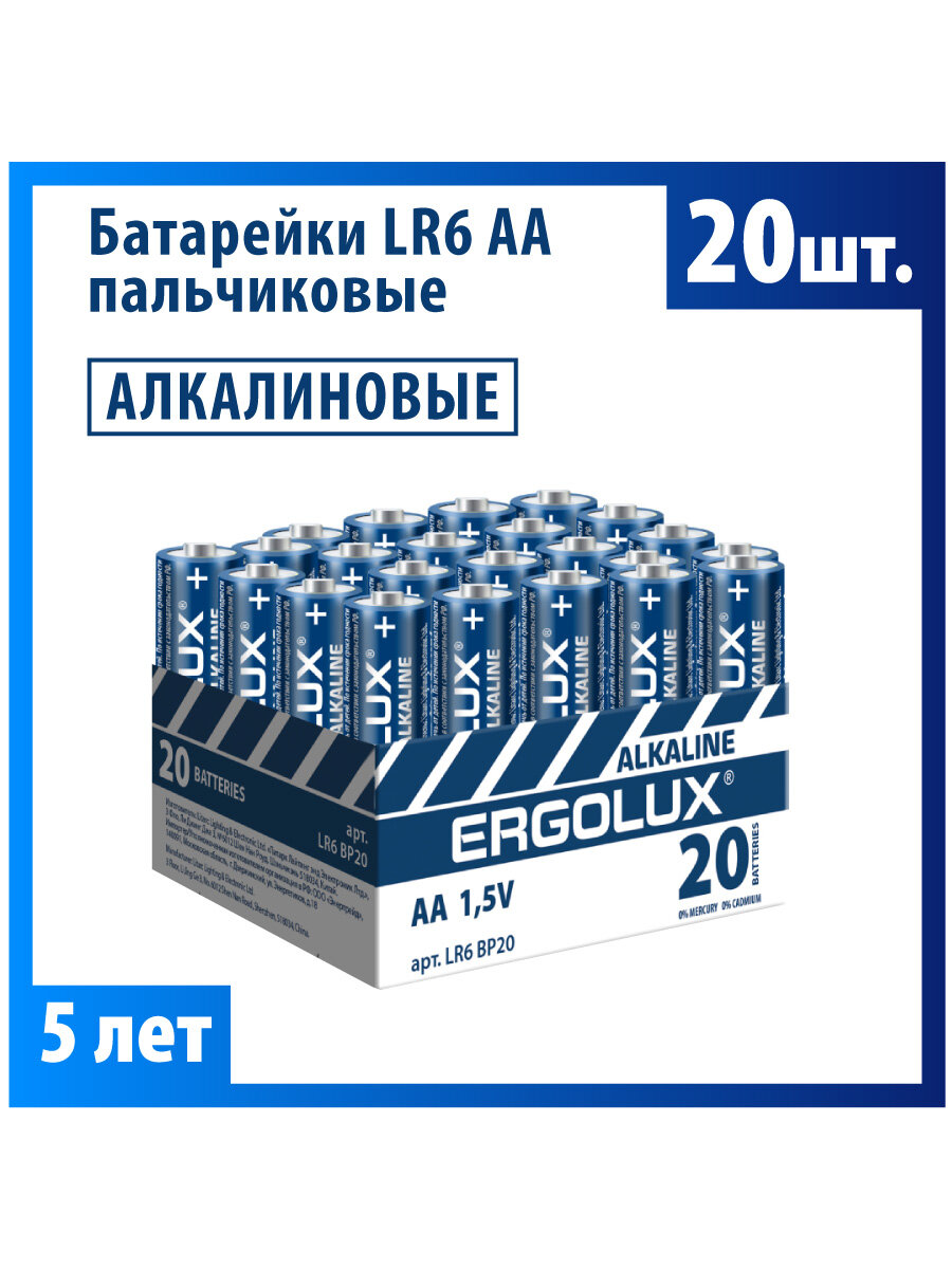 Батарейка Ergolux AA/LR 6 Alkaline BP-20 (LR 6 BP20, 1.5В) (20 шт в уп.), 1 шт.