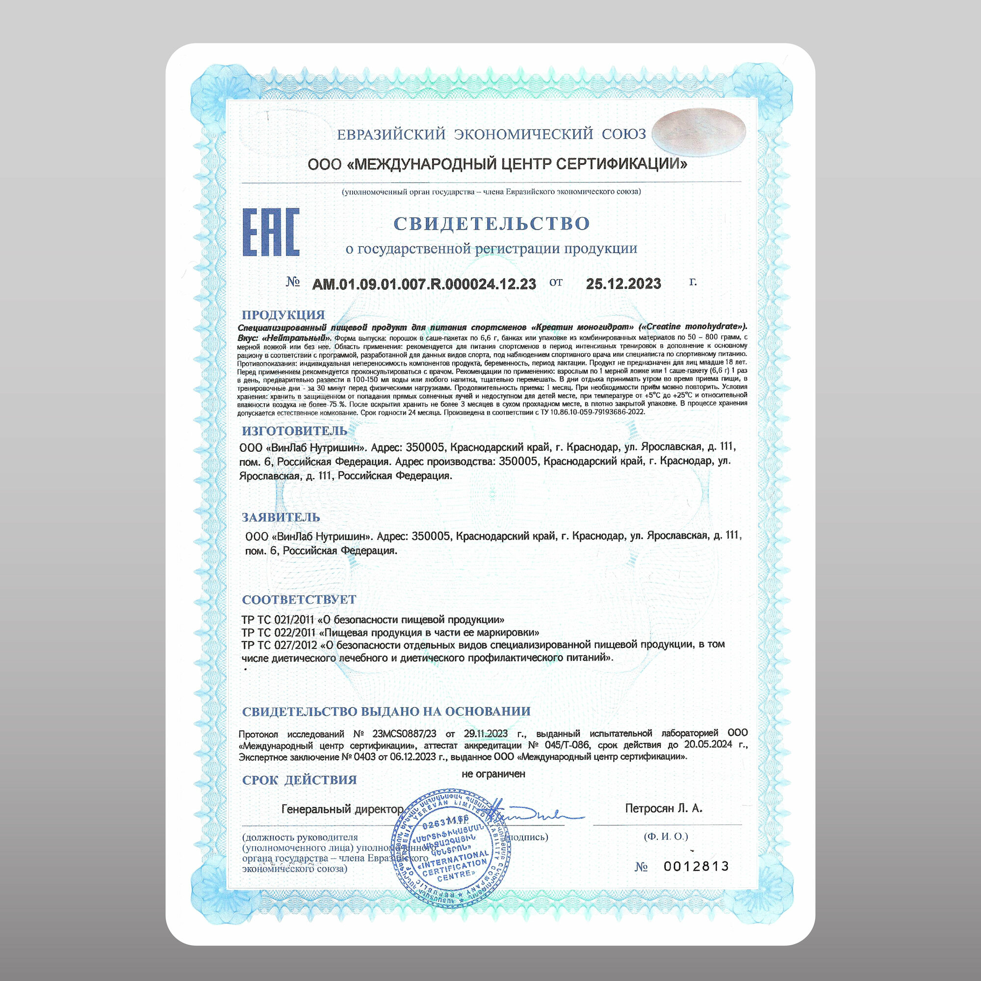 | Дополнительная информация | рекомендации по применению: Рекомендуется принимать по одной мерной ложке (6.6 г), растворив порошок в 250 мл воды или сока; состав: креатин моногидрат, мальтодекстрин, аскорбиновая кислота, подсластитель - сукралоза, ароматизатор |
