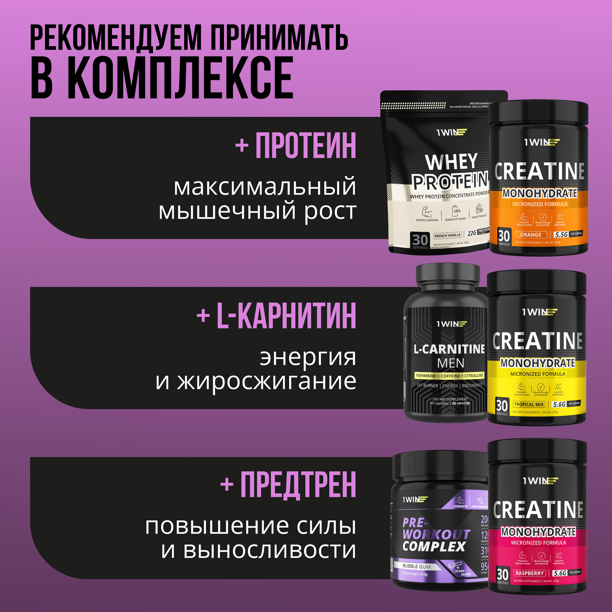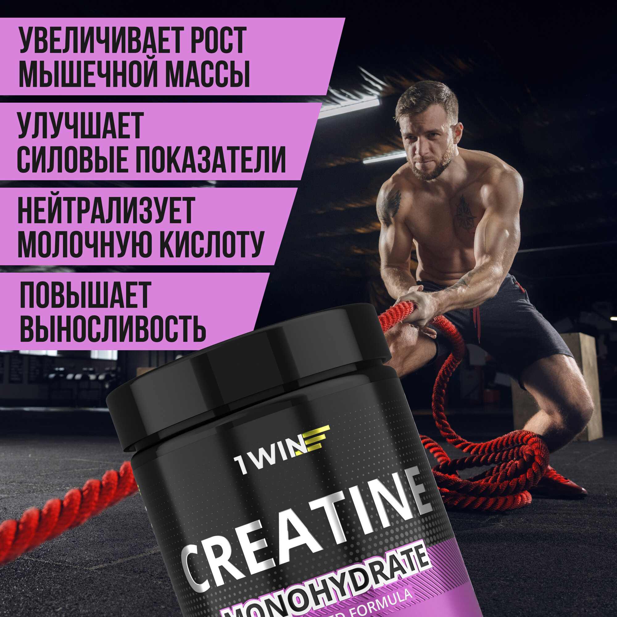Креатин моногидрат порошок 1WIN, Creatine Monohydrate, Вкус Ягодный микс, 60 порций, спортивное питание для набора массы тела