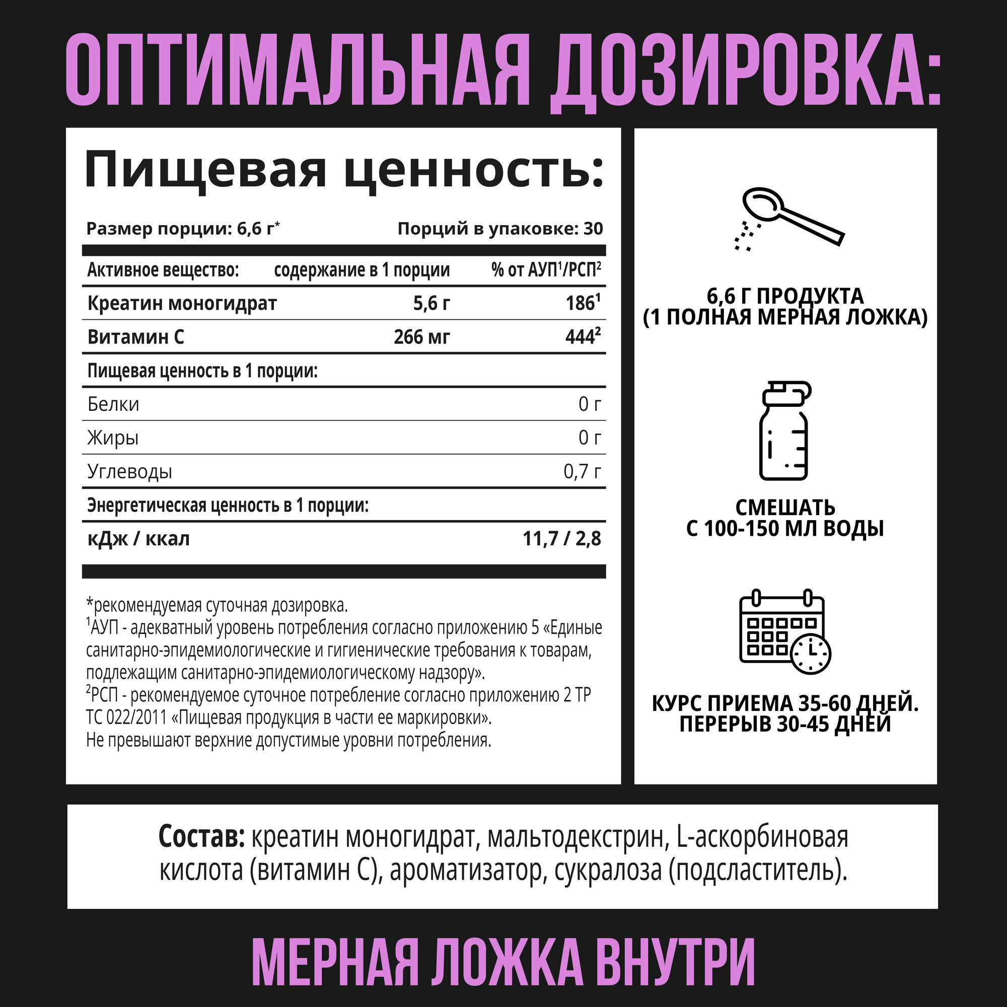 | Дополнительная информация | рекомендации по применению: Рекомендуется принимать по одной мерной ложке (6.6 г), растворив порошок в 250 мл воды или сока; состав: креатин моногидрат, мальтодекстрин, аскорбиновая кислота, подсластитель - сукралоза, ароматизатор |