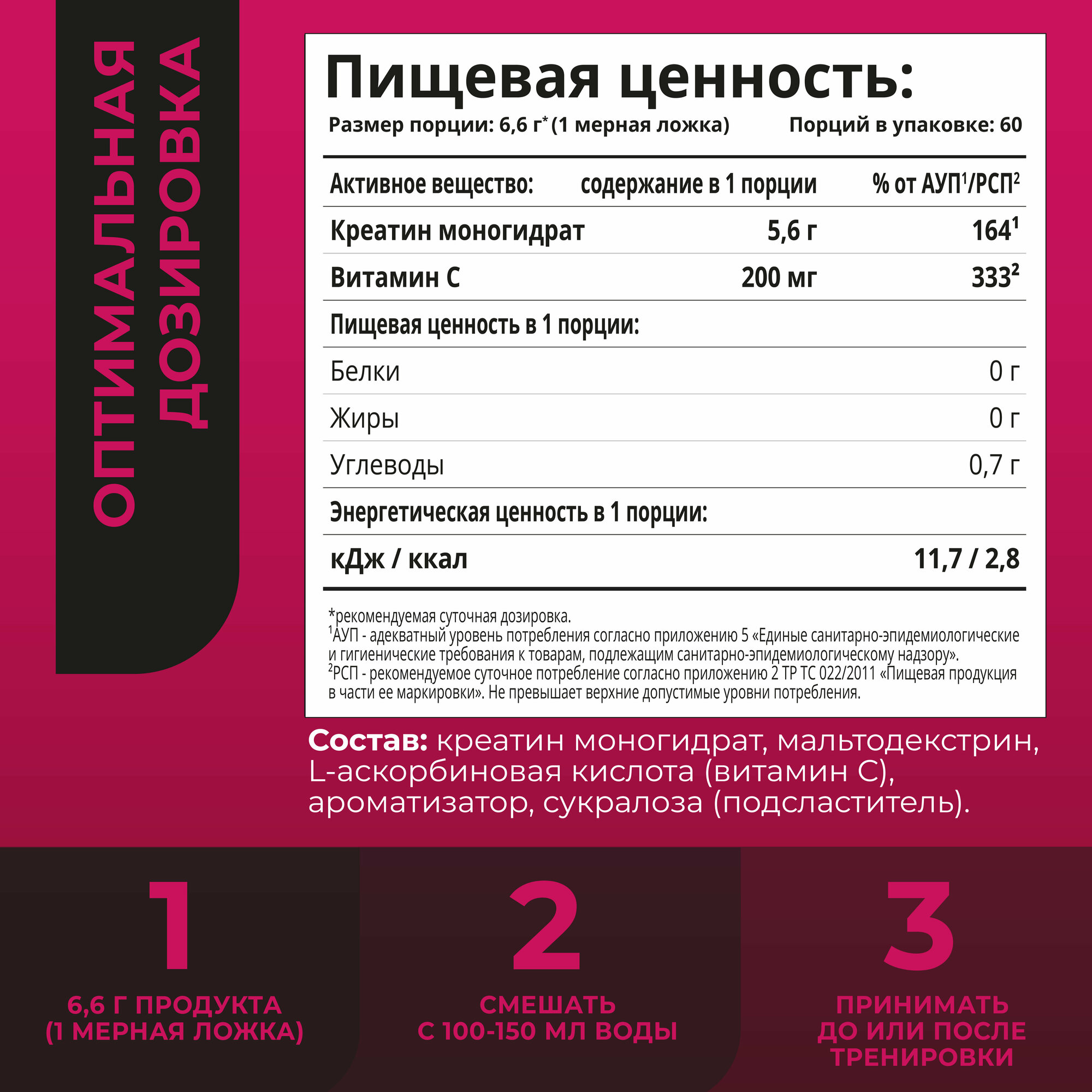 Креатин моногидрат порошок, Вкус Малина, 30 порций, спортивное питание для набора массы тела