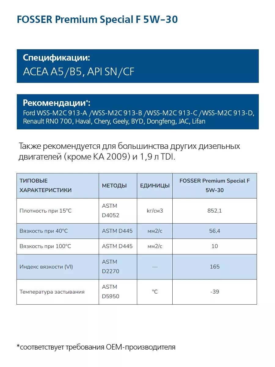 | Допуски OEM | Ford WSS-M2C 913-B / Renault RN 0700 / Ford WSS-M2C 913-C / Ford WSS-M2C 913-D / Ford WSS-M2C 913-A |