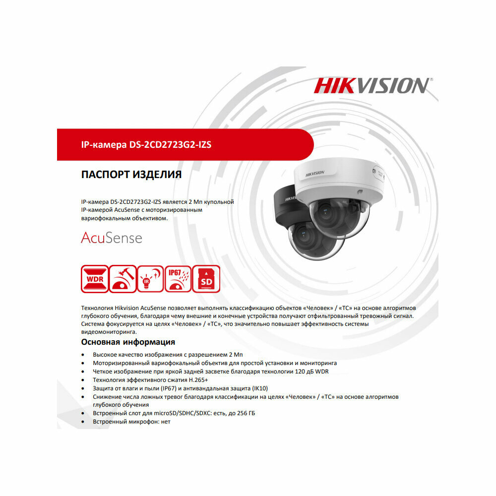 Hikvision DS-2CD2723G2-IZS IP видеокамера купольная уличная 2 MP с EXIR-подсветкой до 40м и технологией AcuSen