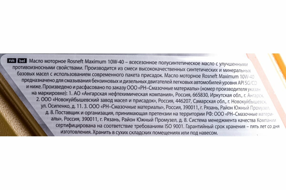 Моторное масло Роснефть (Rosneft) Maximum 10W-40, полусинтетическое, 5 л