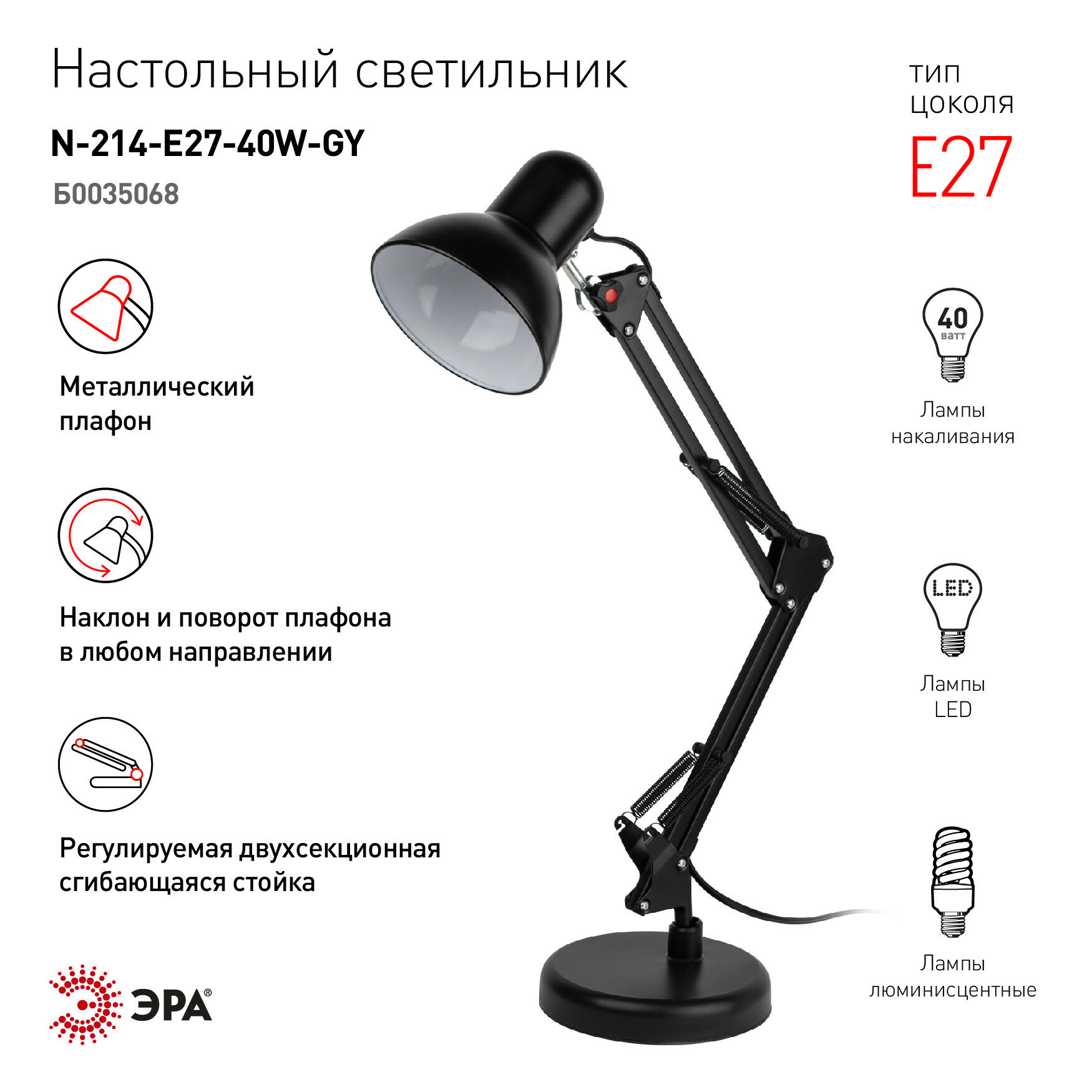 Лампа офисная ЭРА N-214-E27-40W, E27, 40 Вт, черный