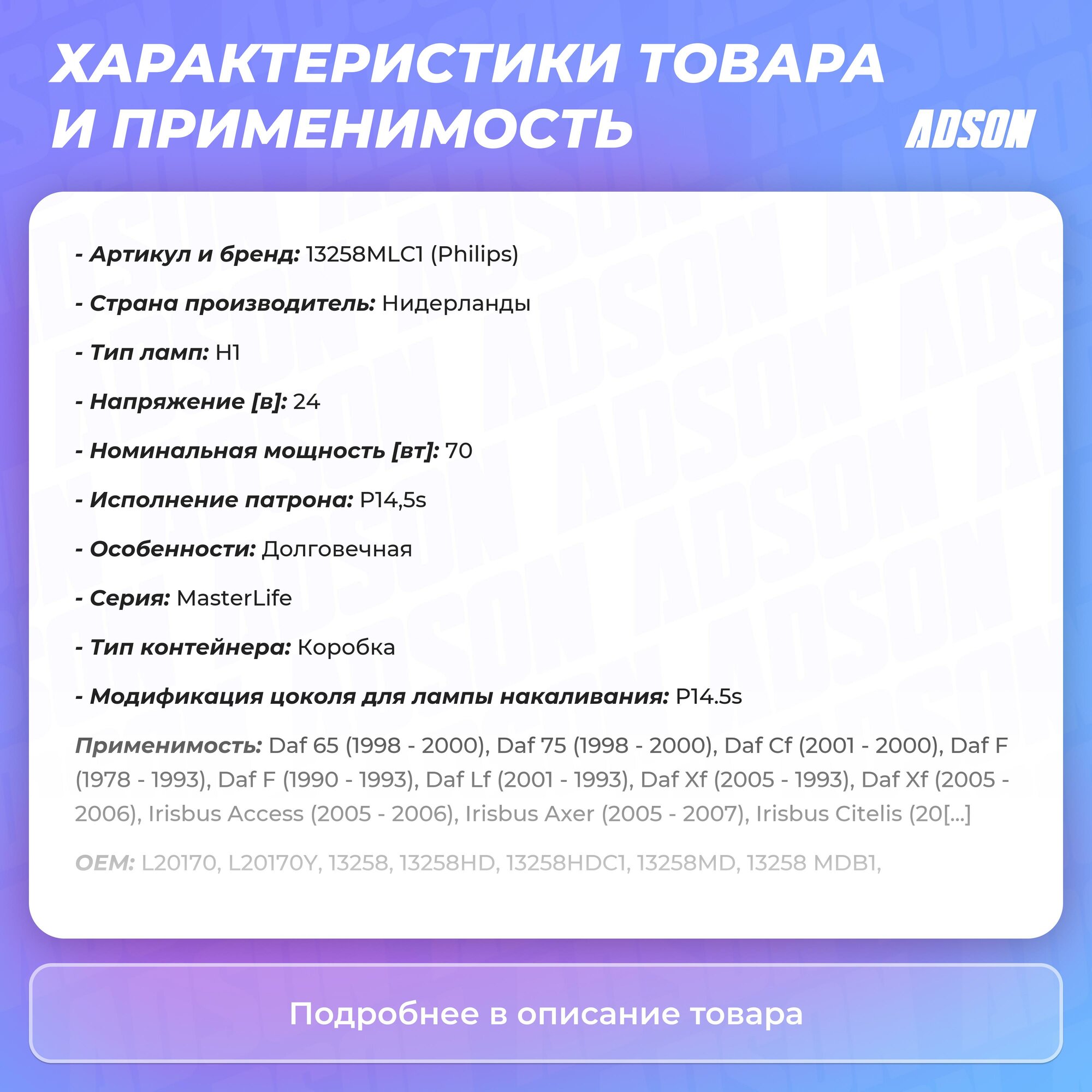 Лампа фары h1 24v 70w p14 5s masterlife Philips 13258MLC1 Daf: 1354887. Faun: 1706111 99708007784. Iveco: 503127216.