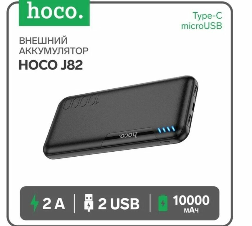 Универсальный Доп. Аккумулятор 10000mAh, J82, HOCO, выход: 2 USB (5V/2A), черный