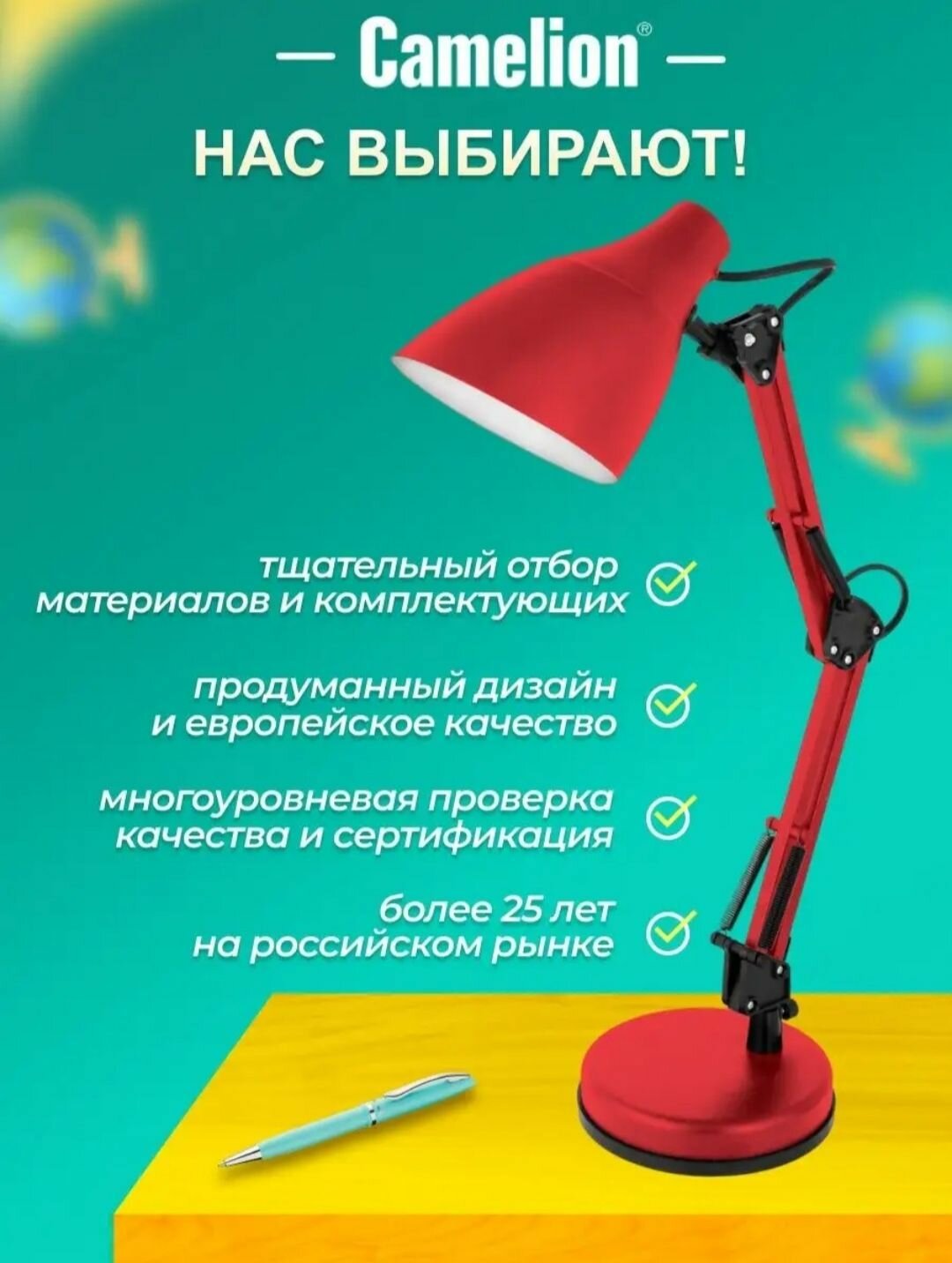 Настольная лампа (светильник) Camelion KD-331 C04 40W E27 металл/красный, провод 1,6м e12792