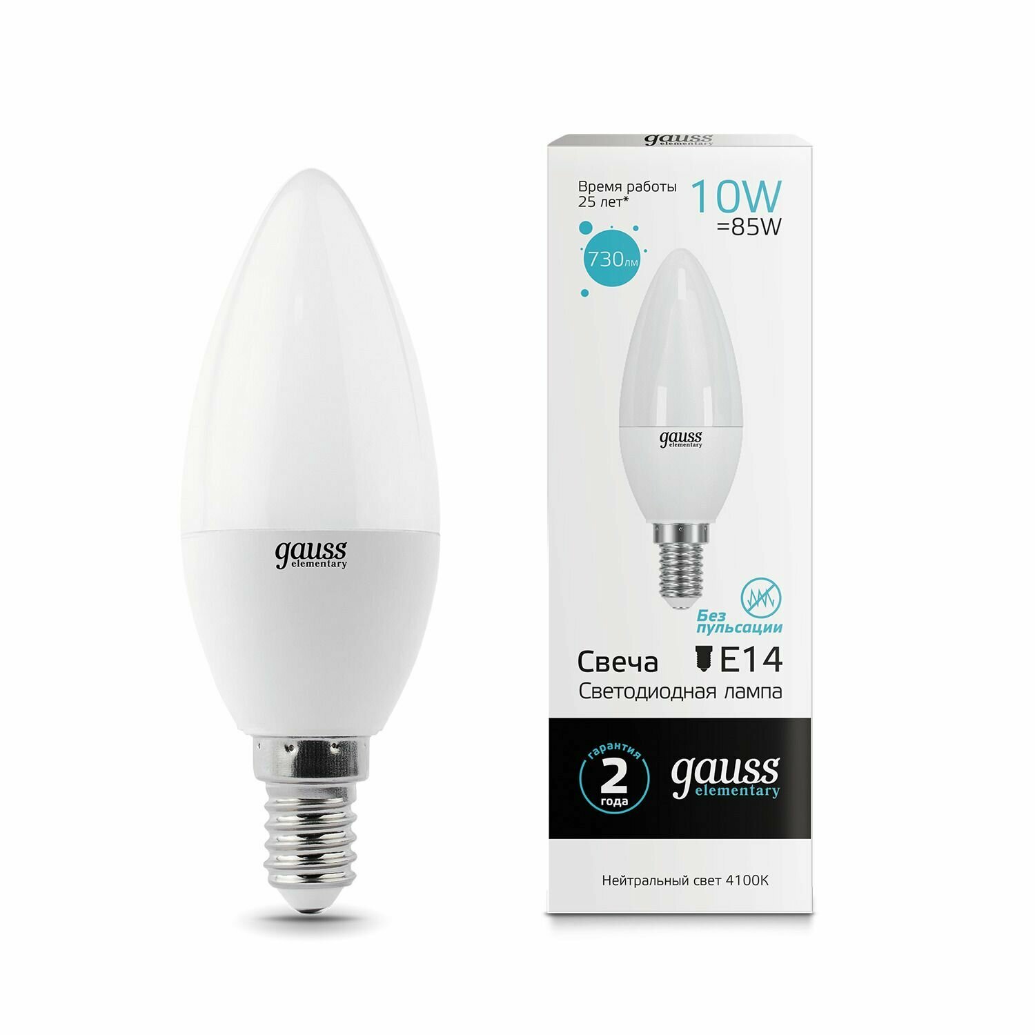 Лампочка светодиодная E14 Свеча 10W нейтр-белый свет 4100K упаковка 10 штук Gauss Elementary