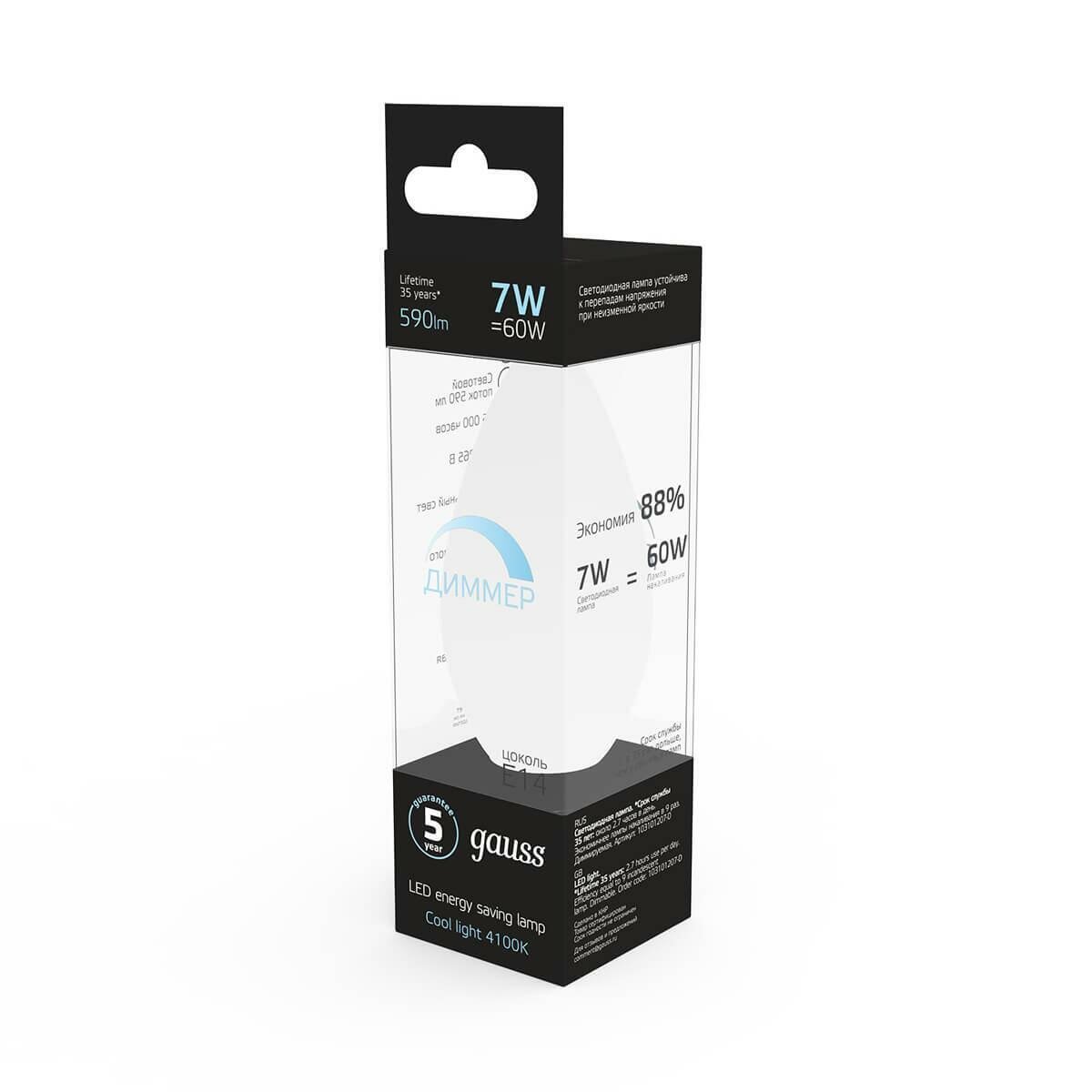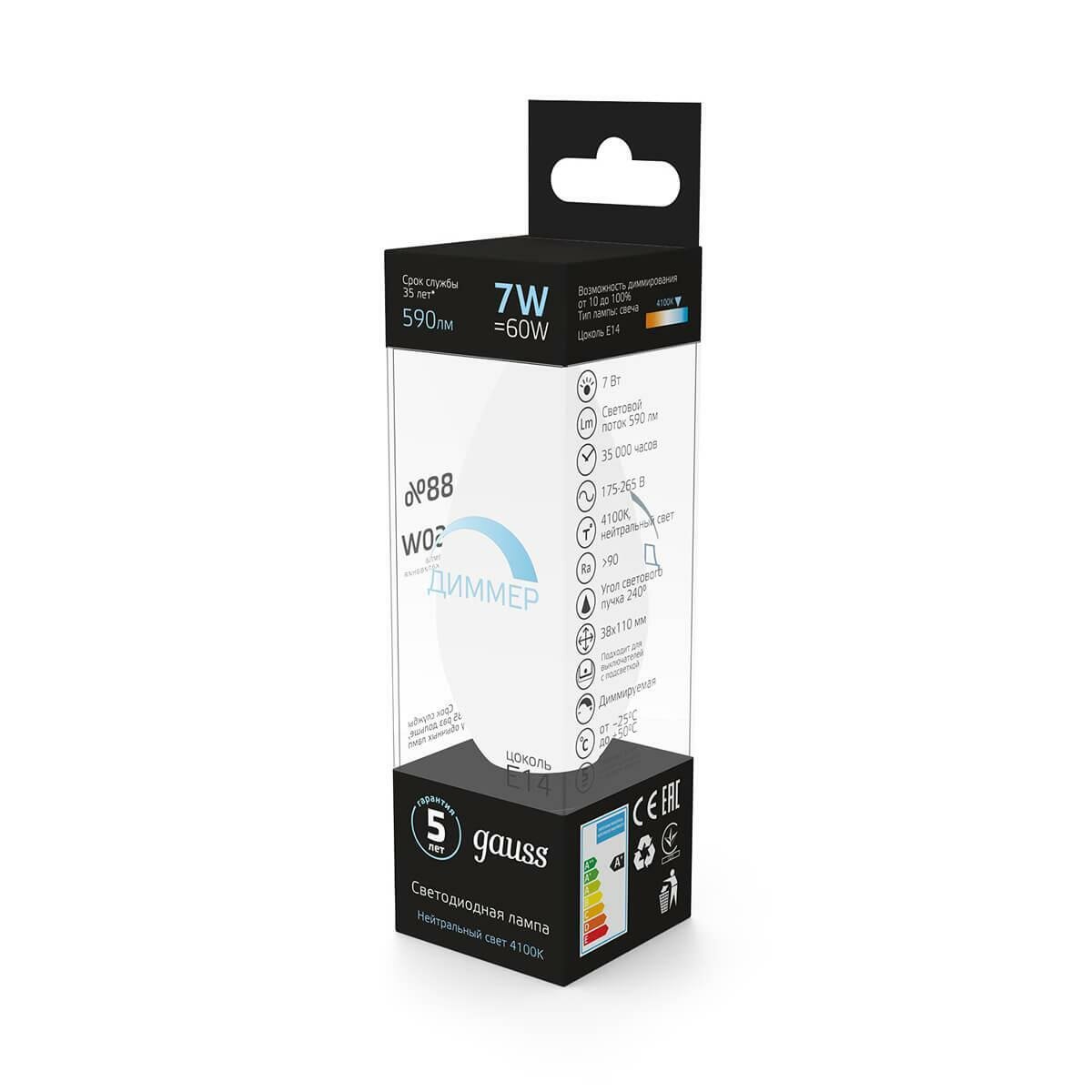 Лампа Gauss LED DIMM 103101207-D Candle E14 7W 4100К диммируемая NEW