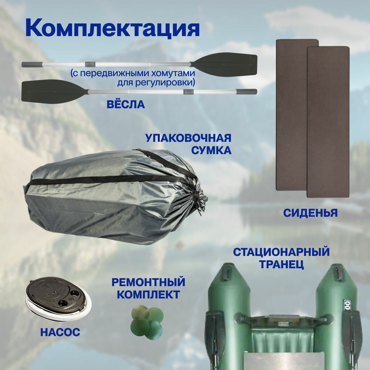 | Комплектация | насос, весла, жесткое сиденье, уключины, ручки для переноски, леерный трос |