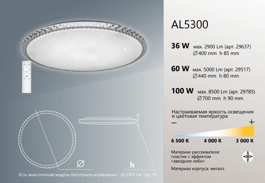 Светильник светодиодный управляемый с пультом 70W, Max. 5300Lum, 3000К-6000K, IP20, AL5300 BRILLIANT