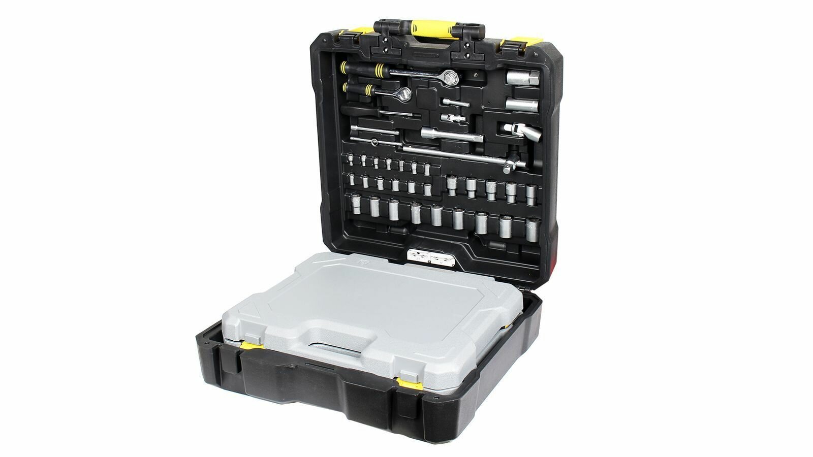 | Дополнительная информация | передвижной чемодан (2 в 1) со съемной ручкой; отвертка с храповым механизмом и реверсом 1/4"; держатель магнитный 60мм для бит 1/4"; механический тестер давления шин; уровень строительный 225 мм; зажимы универсальные – 2 шт.; трещотки 1/4"и 1/2"; воротки Т - образные: 1/4", 1/2"; карданы шарнирные: 1/4", 1/2"; удлинитель 1/2" 125 мм; удлинители 1/4": 50, 100 мм; рукоятка для головок 1/4"; комплект метизов (гвозди, саморезы, дюбеля, крючки); комплект хомутов |