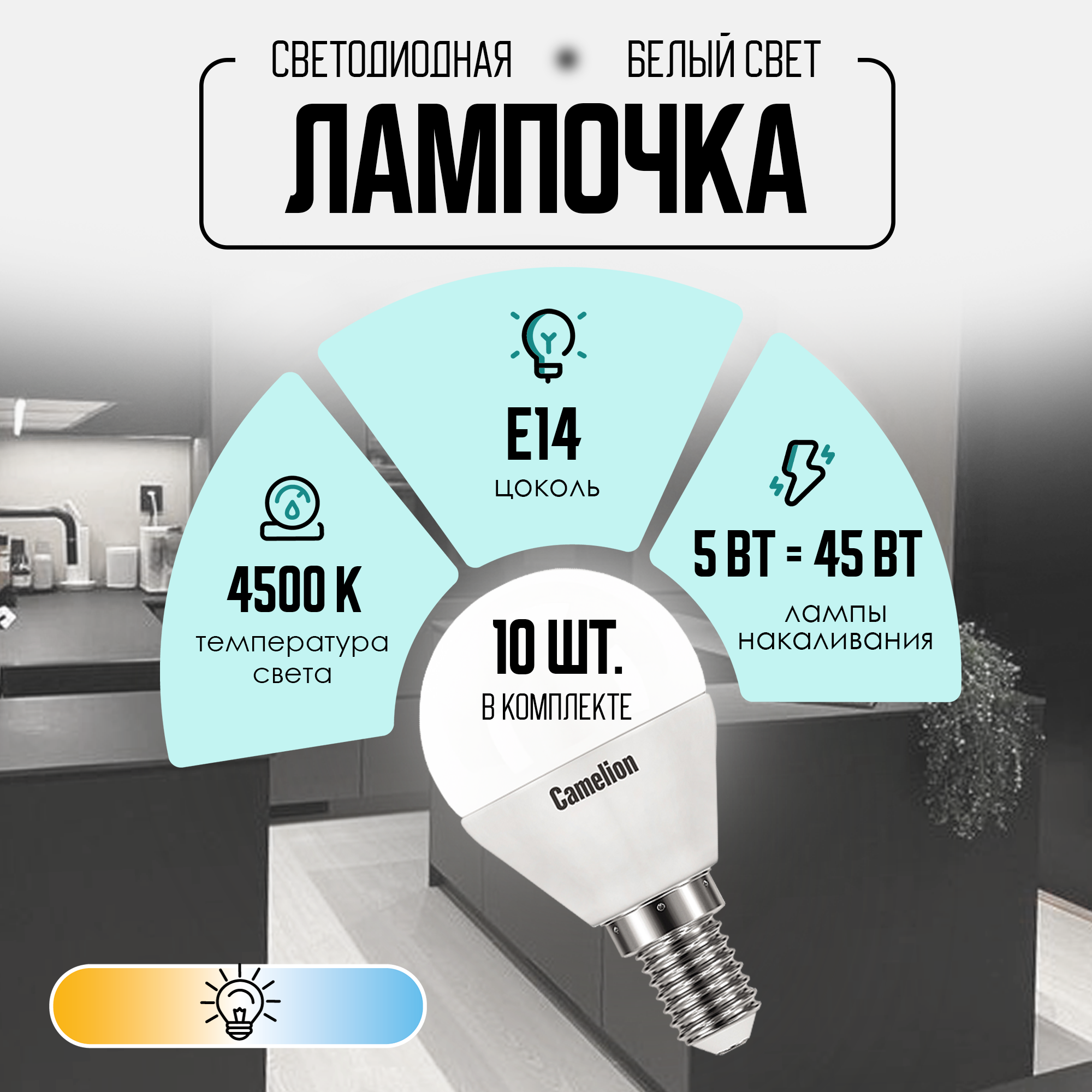 Лампа светодиодная E14, 5 Вт, 45 Вт, шар, 4500 К, свет холодный белый, Camelion
