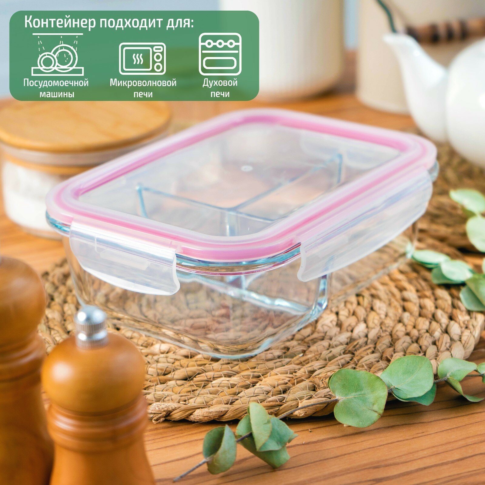 Контейнер объемом 1500 мл из жаропрочного стекла с герметичной крышкой из пластика