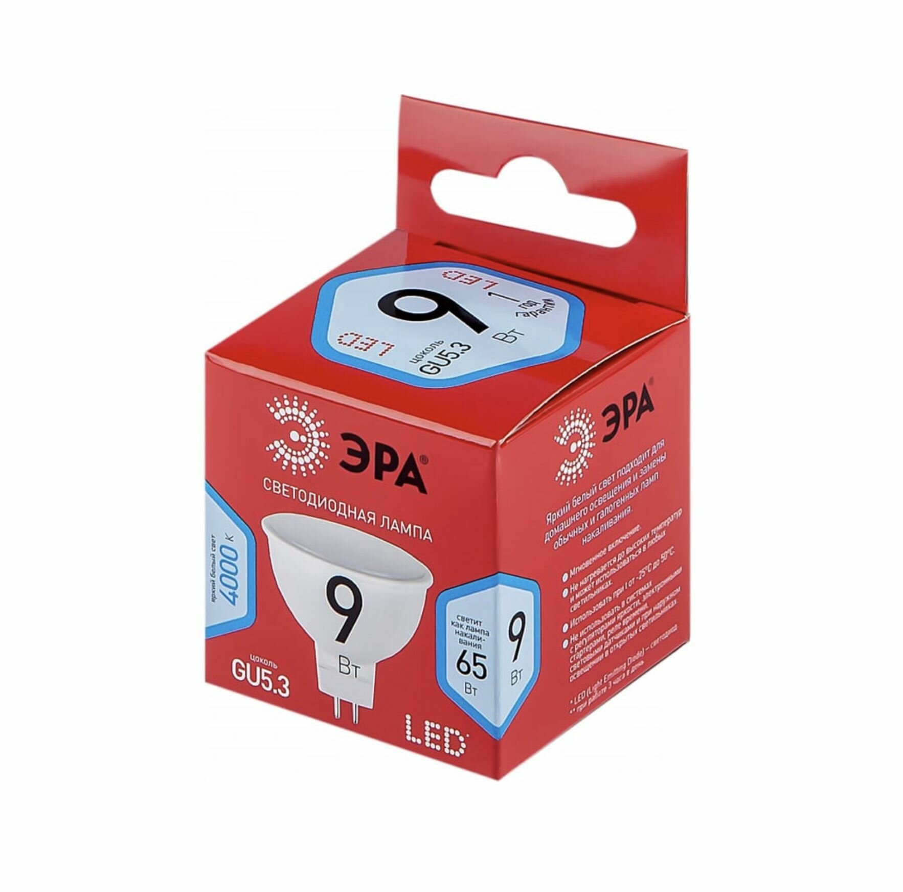 (9 шт.) Светодиодная лампочка ЭРА, мощность 9 Вт, напряжение питания 220 В, цветовая температура 4000 К, нейтральный белый свет, Световой поток 400 ЛМ, цоколь GU5.3, размер 50х50