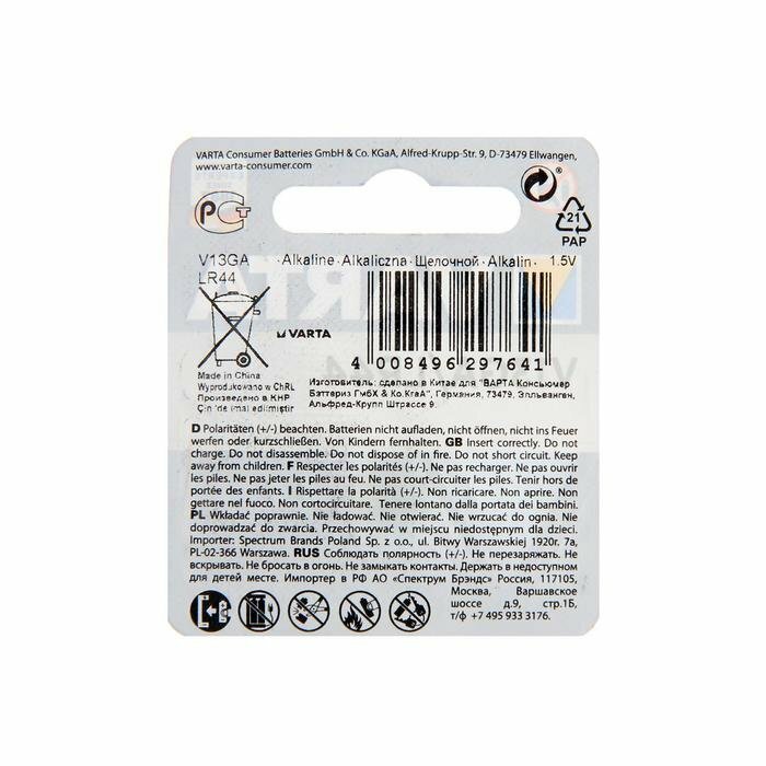 Элемент питания Varta Alkaline V13GA (LR44/ LR1154/ G13/ A76/ AG13/ SR44W/ V357)