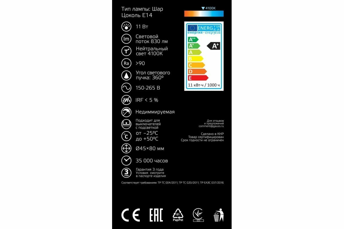 Ниже Вы можете прочитать отзывы на Лампа светодиодная gauss 105801211, E14, 11 Вт, 4100 К, ознакомится с подробными характеристиками, посмотреть интересные обзоры и фотографии на Лампа светодиодная gauss 105801211, E14, 11 Вт, 4100 К.