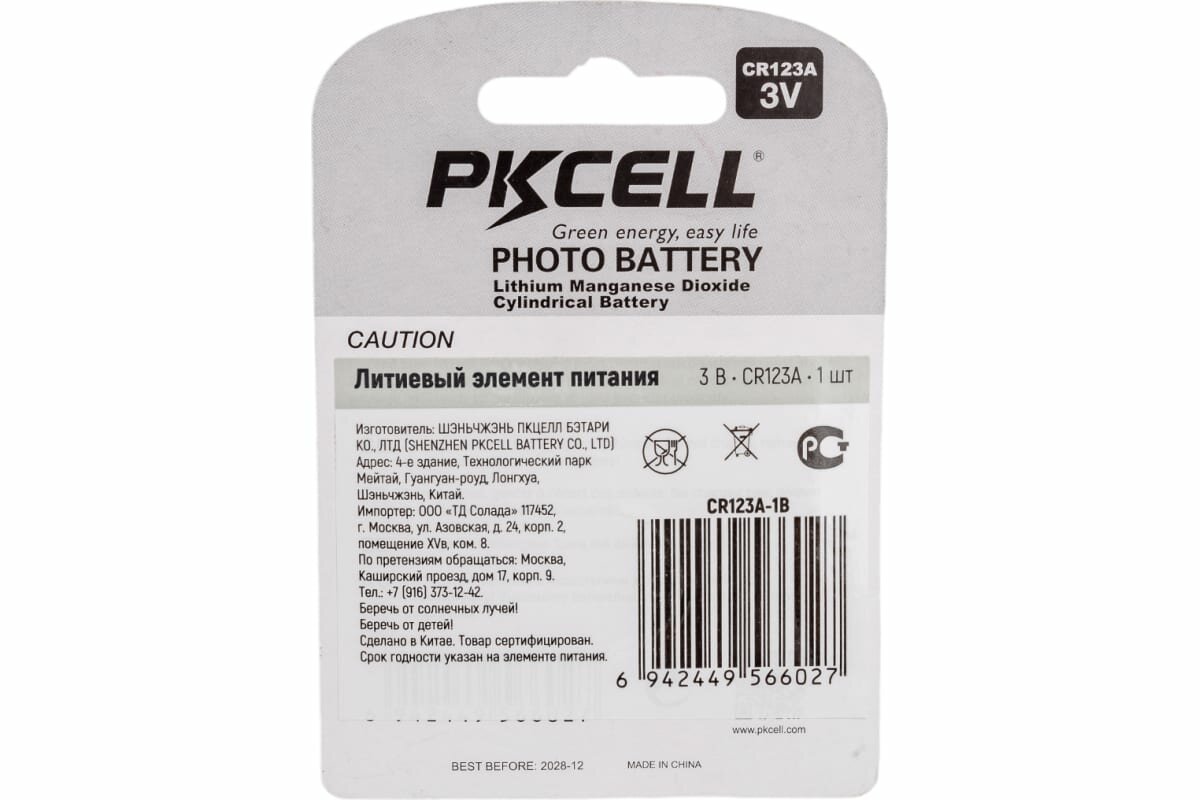 Литиевый элемент питания PKCELL CR123A-1B тип - CR123A, 1 штука в блистере