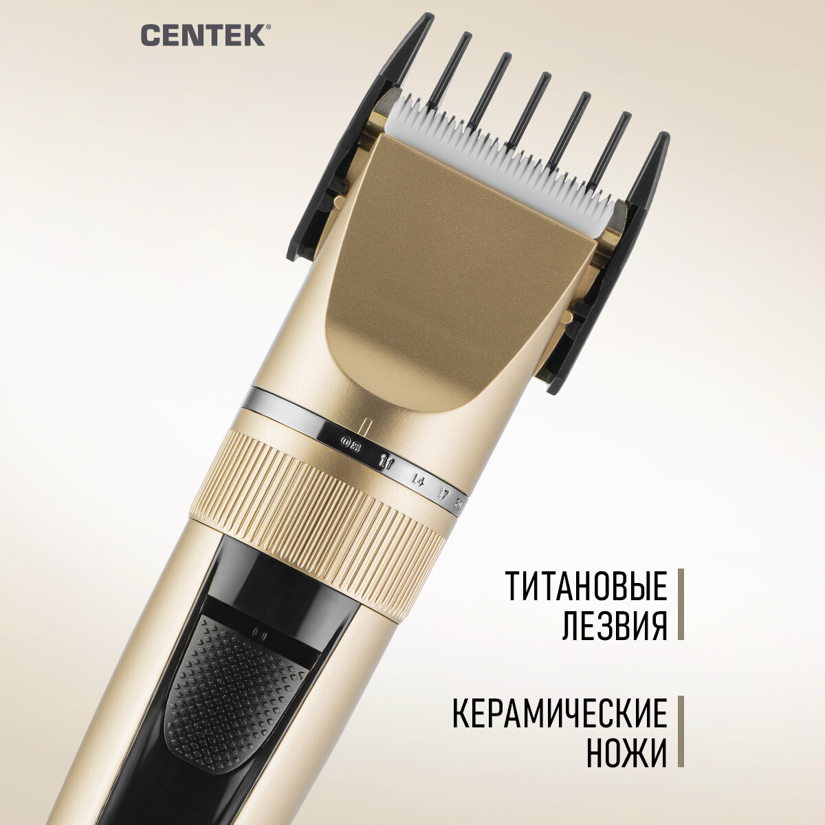 Машинка для стрижки Centek CT-2119 (черный/золот) сеть/аккум, ножититан+керамика, 180 мин от батареи