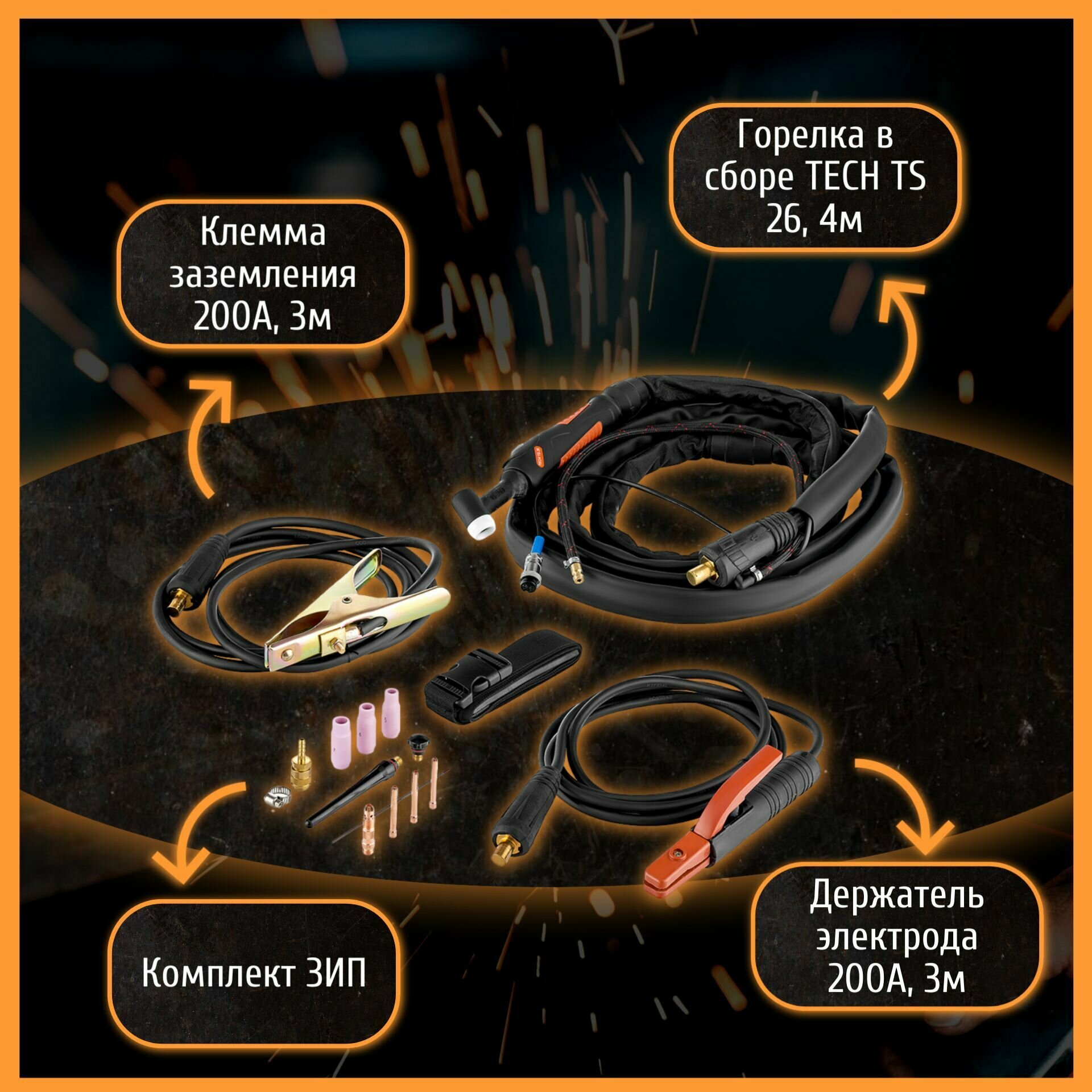 | Комплектация | инверторный сварочный аппарат, горелка в сборе TECH TS 26, 4 м, клемма заземления в сборе 200 А, 3 м, электрододержатель в сборе 200 А, 3 м, комплект ЗИП, руководство по эксплуатации, паспорт |