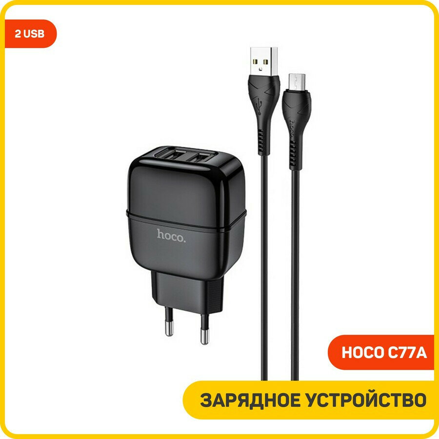Сетевое зарядное устройство (СЗУ) Hoco C77A (2 USB) + кабель MicroUSB, 2.4 А, черный