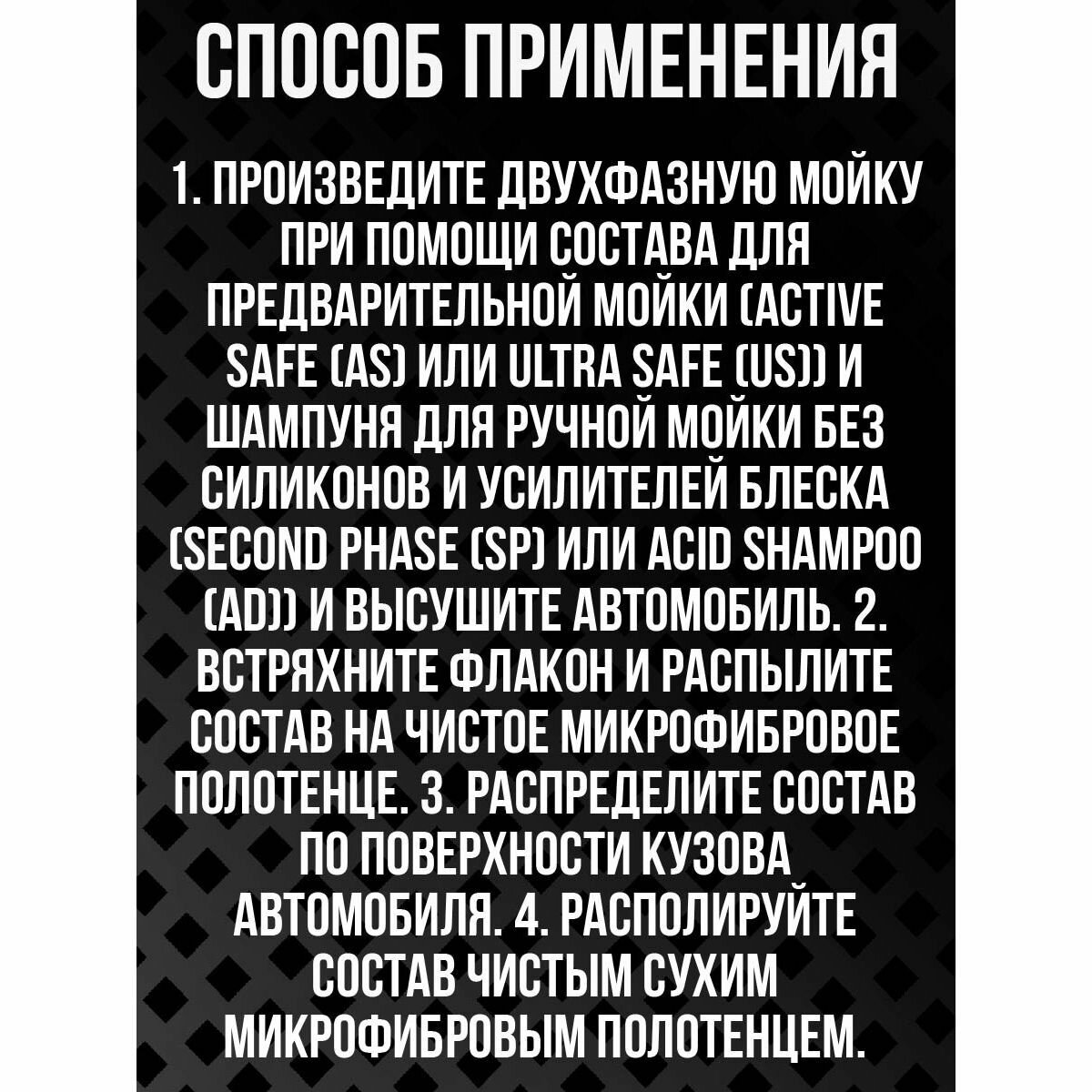 | Способ применения | 1. Охладите поверхность перед нанесением. 2. Помойте автомобиль, используя Active Safe (AS) и Second Phase (SP), а также обезжирьте при помощи Remover (RE). 3. Наносите состав на охлажденную и очищенную поверхность. Для нанесения рекомендуется использовать микрофибровое полотенце. 4. Распределите состав на небольшой участок. Не дожидаясь высыхания, располируйте состав сухой стороной микрофибрового полотенца. Располировка должна производиться прямолинейными движениями. |