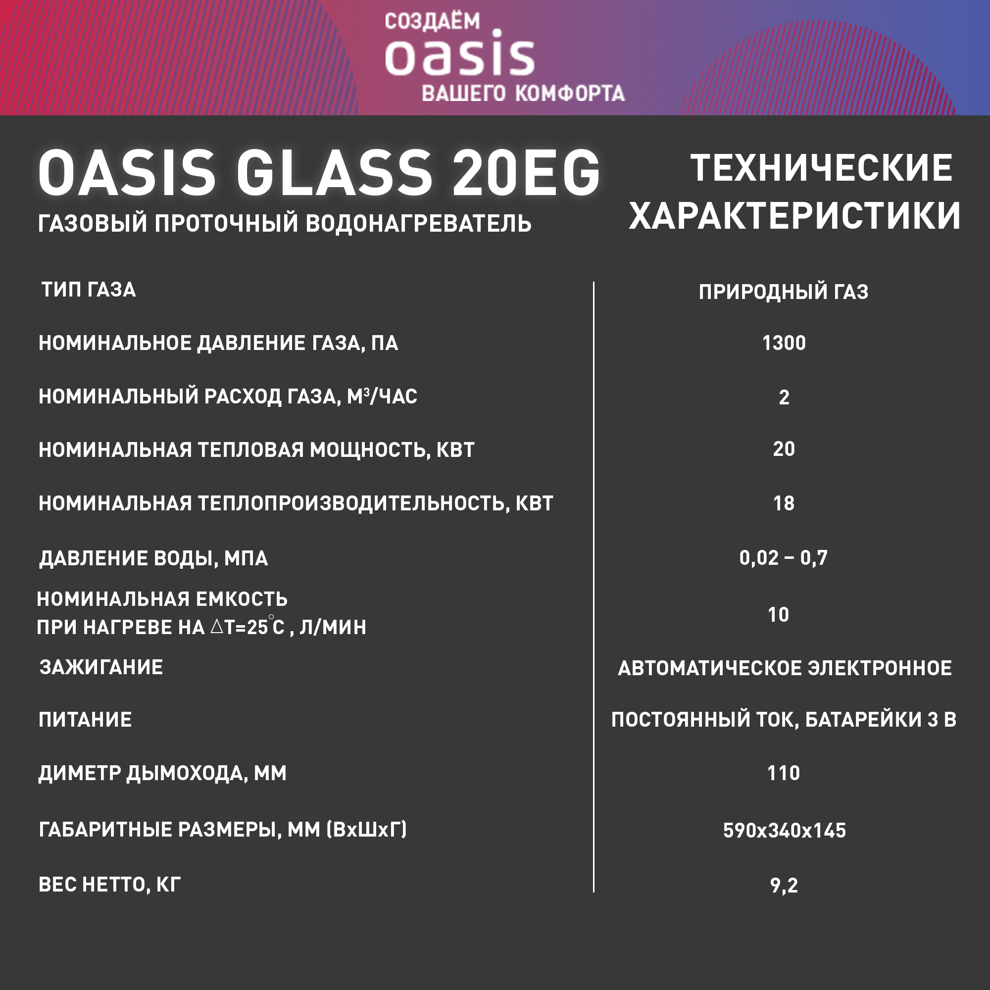 Водонагреватель OASIS Водонагреватель GAS 10L/MIN GLASS 20 ZG OASIS