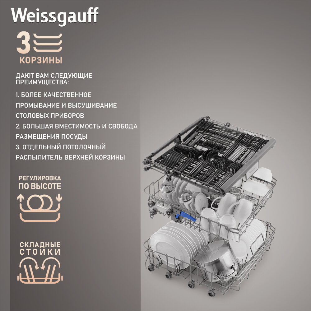 Посудомоечная машина с авто-открыванием и инвертором Weissgauff DW 6038 Inverter Touch,3 года гарантии,3 корзины, 14 комплектов, 9 программ, быстрый режим, режим стерилизации, полная защиты от протечек, Таймер до 24 часов, сенсорное управление