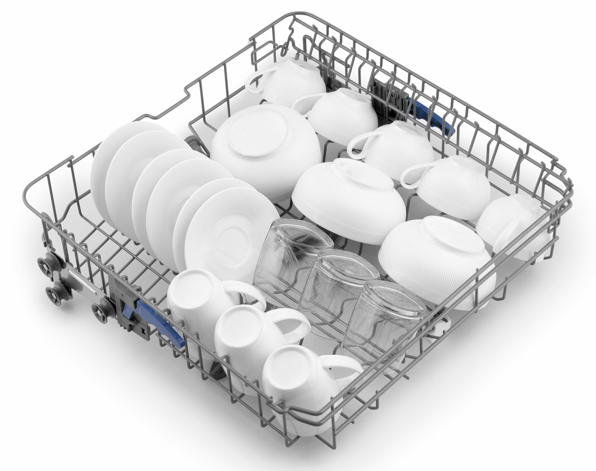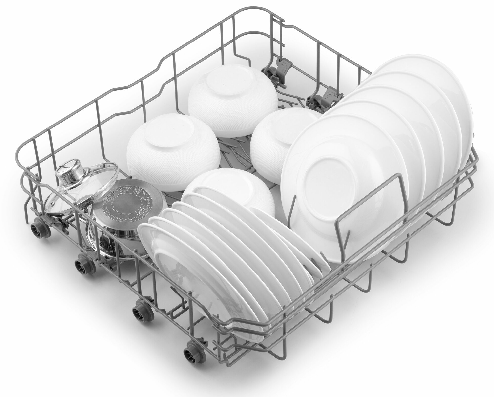 Также очень здорово, что в лотках некоторые держатели для посуды можно убрать. Например, в нижнем лотке можно сложить держатели для тарелок. Это позволит уместить в посудомойку даже кастрюли |