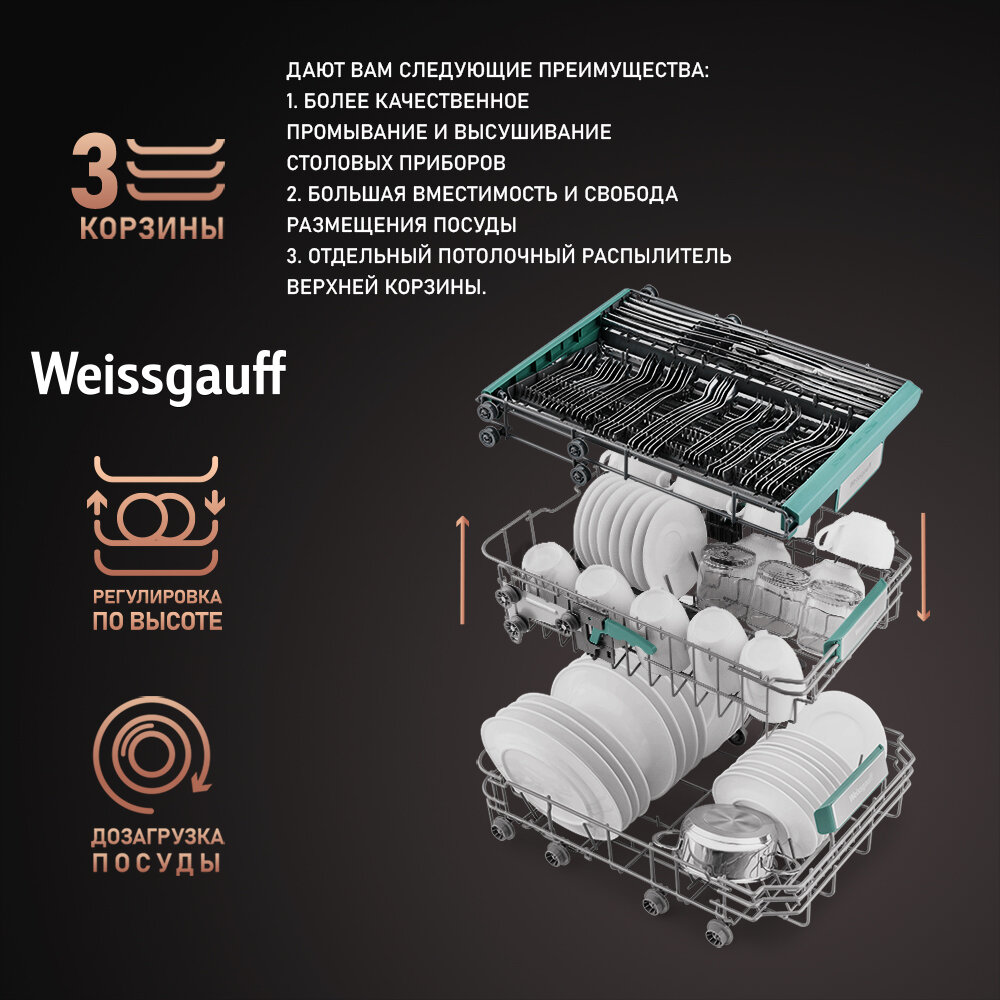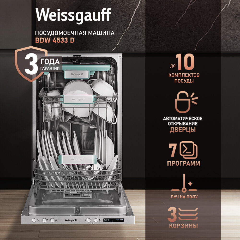 Встраиваемая посудомоечная машина с лучом на полу и авто-открыванием Weissgauff BDW 4533 D (модификация 2024 года),3 года гарантии,3 корзины, 14 комплектов, 7 программ, Половинная загрузка, Быстрая мойка 30 мин, Авто программа, Полная защита от протечек