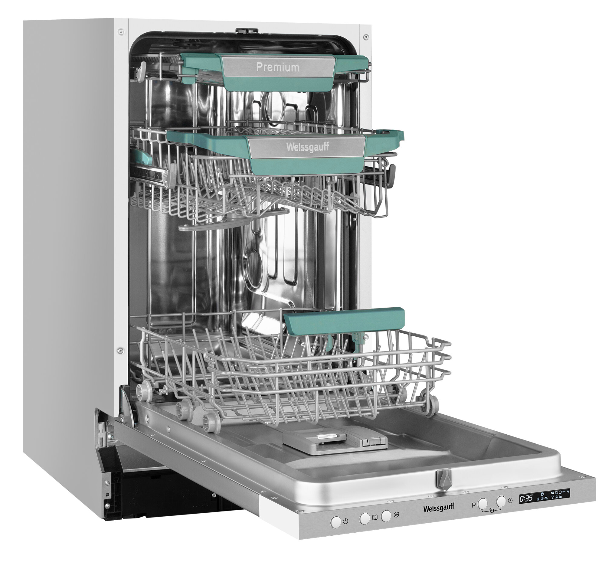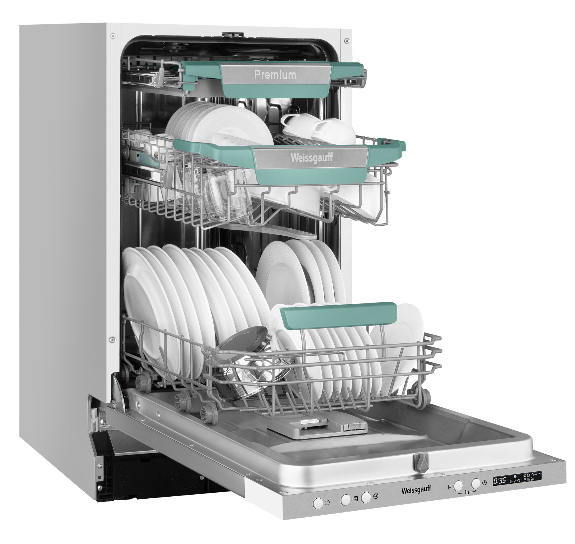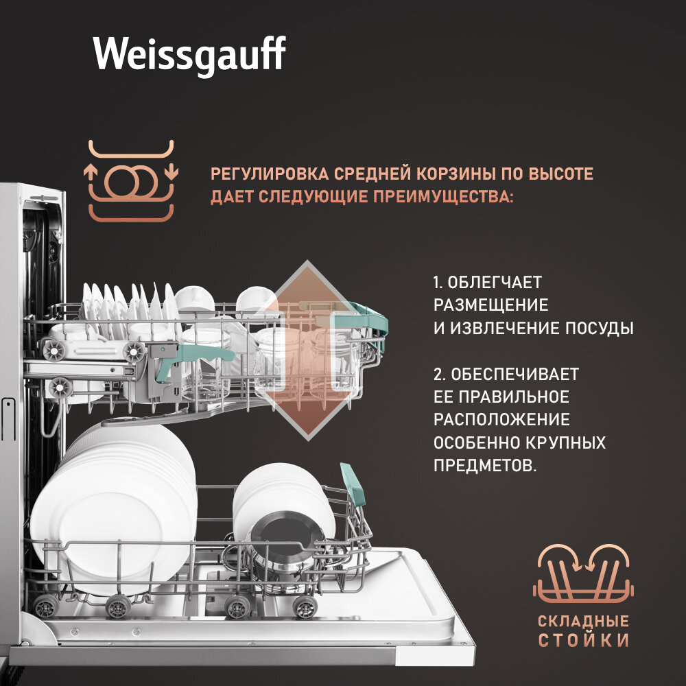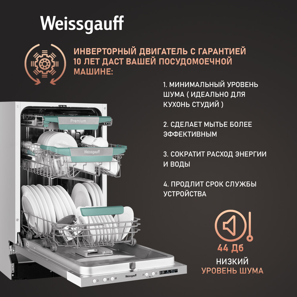 Встраиваемая посудомоечная машина WEISSGAUFF BDW 4573 D, узкая, ширина 44.8см, полновстраиваемая, загрузка 10 комплектов