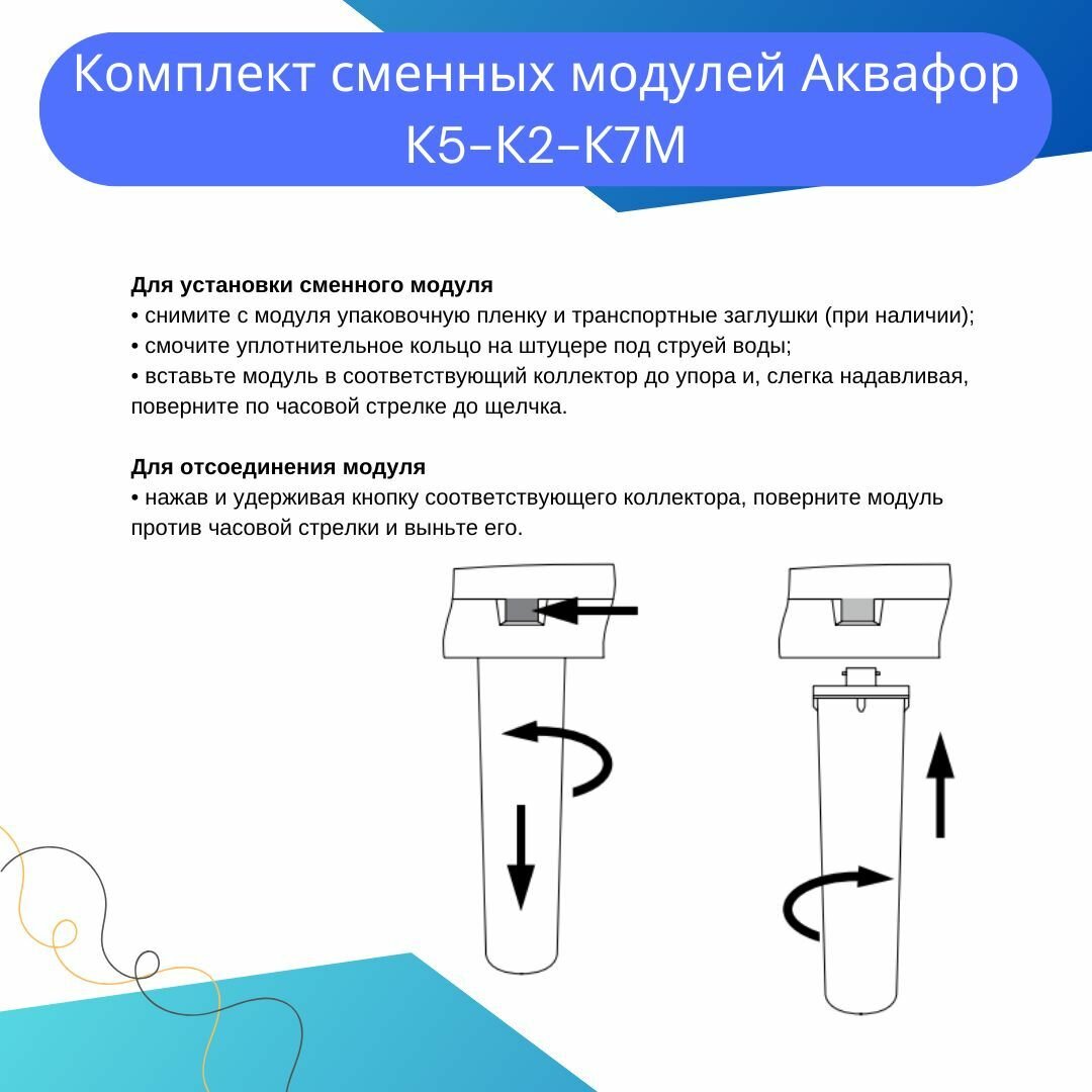 | Дополнительная информация | для фильтра DWM-101S и DWM-101; в комплекте три модуля: K5 - предварительная очистка; K2 - глубокая фильтрация; K7M - постфильтрация и минерализация |