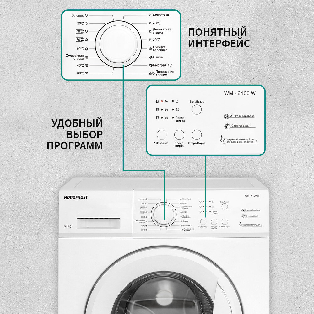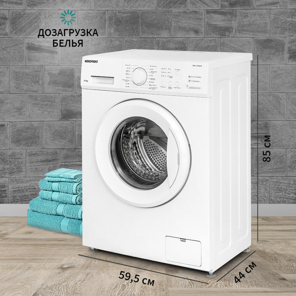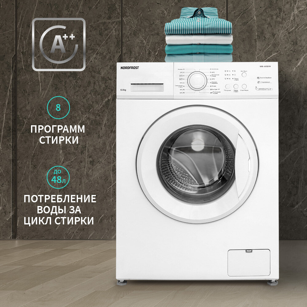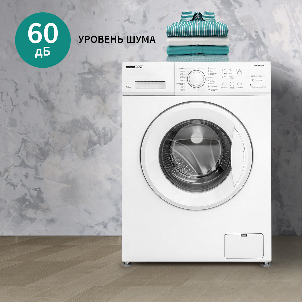Стиральная машина NORDFROST WM 6100 W, 6 кг загрузка, 40 л объем, 1000об/мин,8 программ, отсрочка старта, быстрая стирка, цвет белый