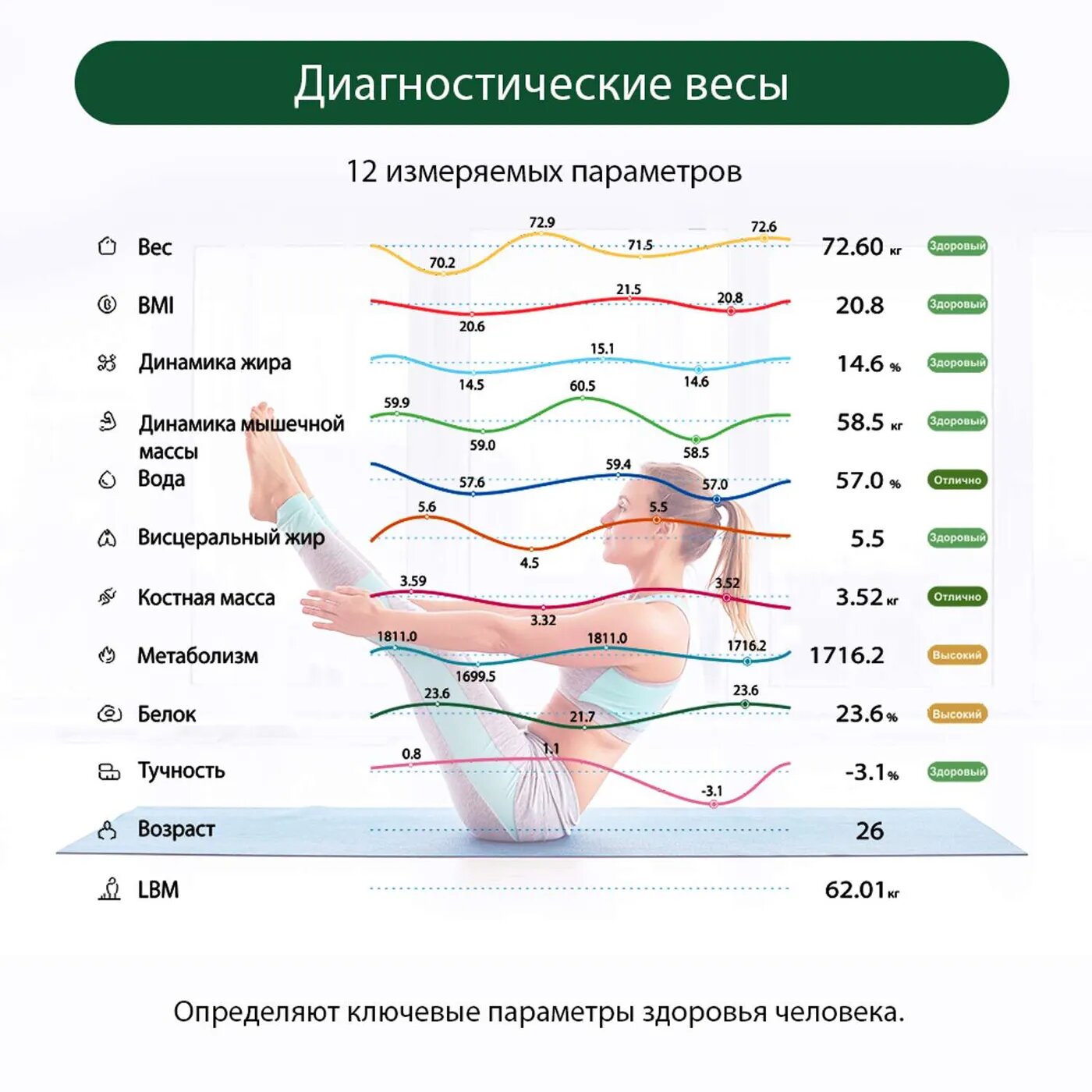 | Дополнительные функции | определение доли жировой ткани / определение доли мышечной ткани / определение доли воды / определение доли костной ткани / расчет ИМТ (BMI) / постановка цели / память |