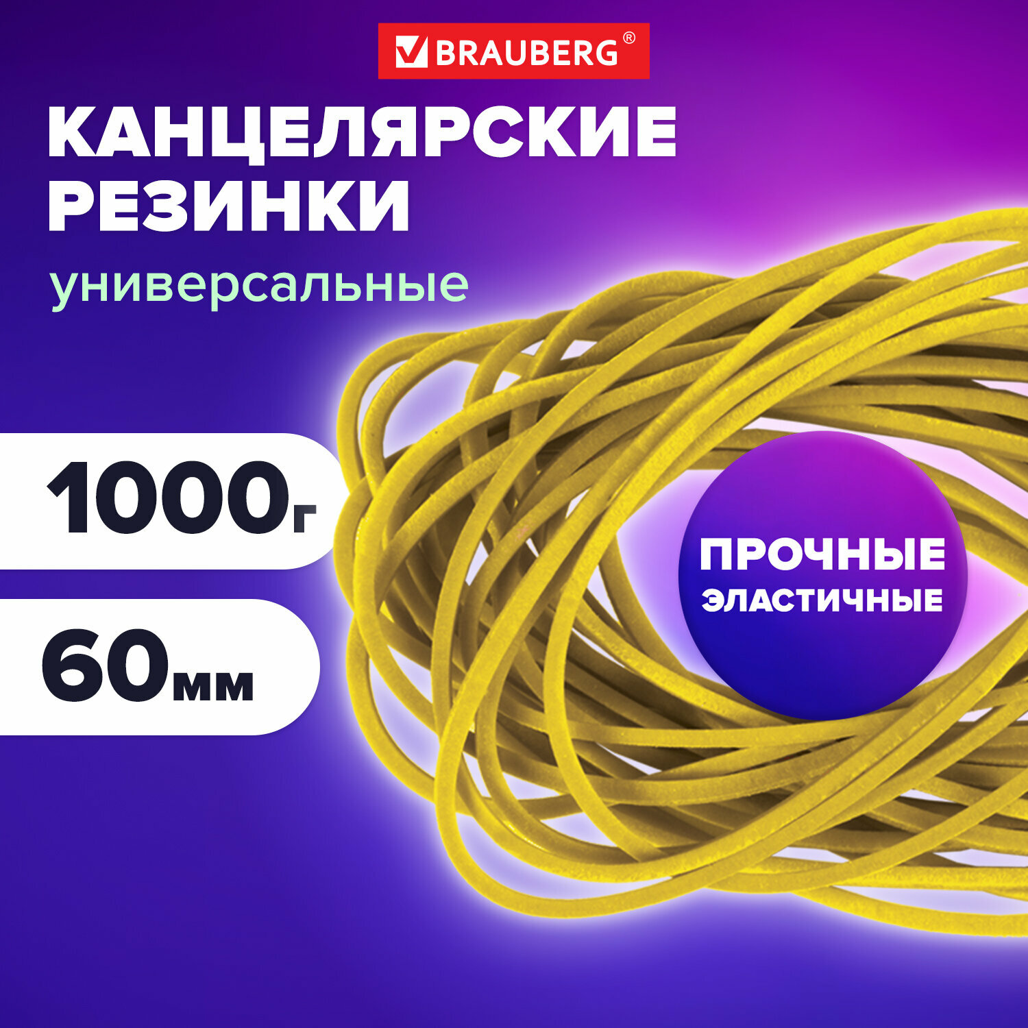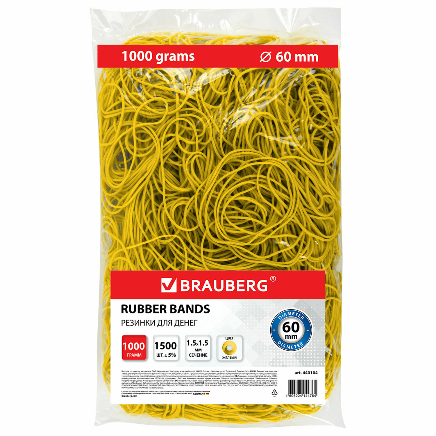 Резинки банковские универсальные диаметром 60мм, BRAUBERG 1000 г, желтые, натуральный каучук, 440104
