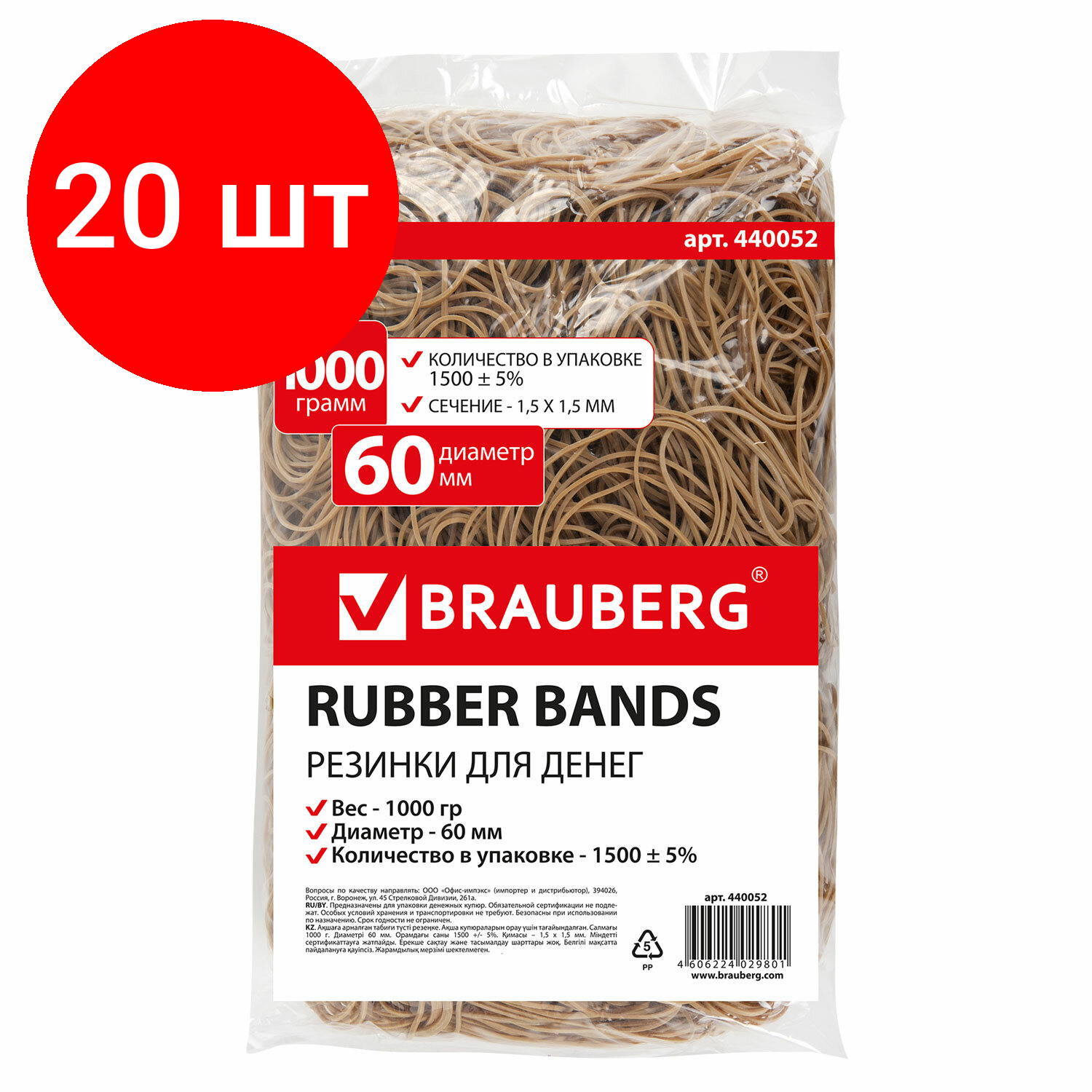 СохранитьКомплект 20 шт, Резинки банковские универсальные диаметром 60 мм, BRAUBERG 1000 г, натуральный цвет, натуральный каучук, 440052 интересное: