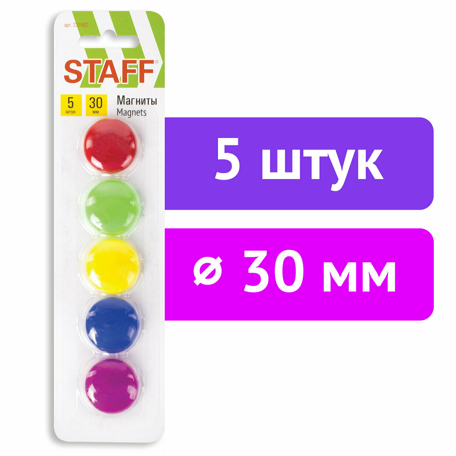 Магниты среднего диаметра, 30 мм, набор 5 штук, цвет ассорти, в блистере, STAFF "Basic", 237482
