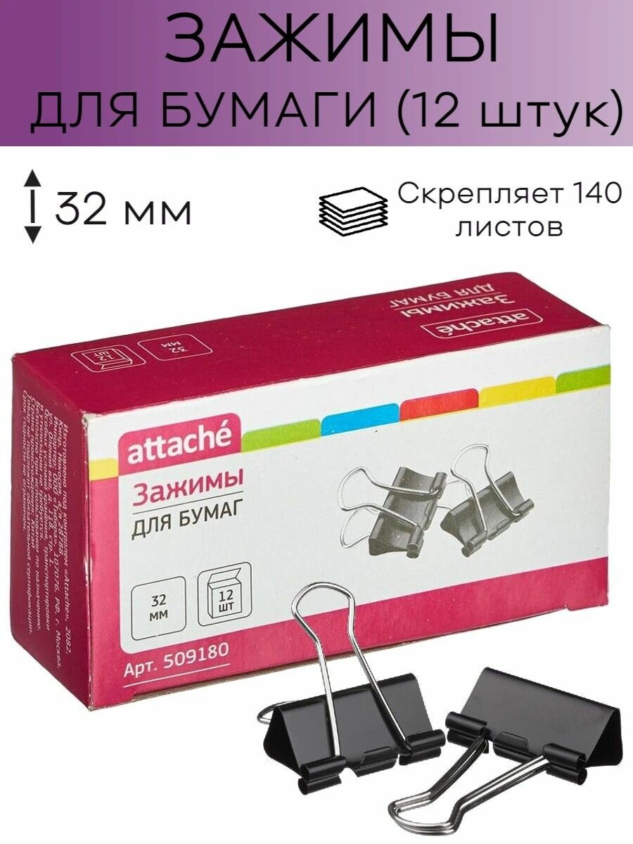 Зажимы для бумаг Attache 32 мм черные (12 штук в упаковке), 509180