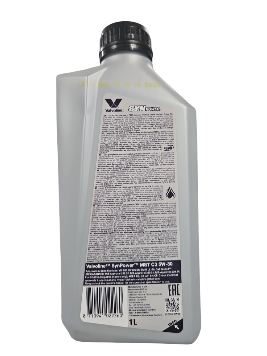VALVOLINE 874308 VALVOLINE SYNPOWER MST C3 5W30 5 VALVOLINE SYNPOWER MST C3 5W30 5
