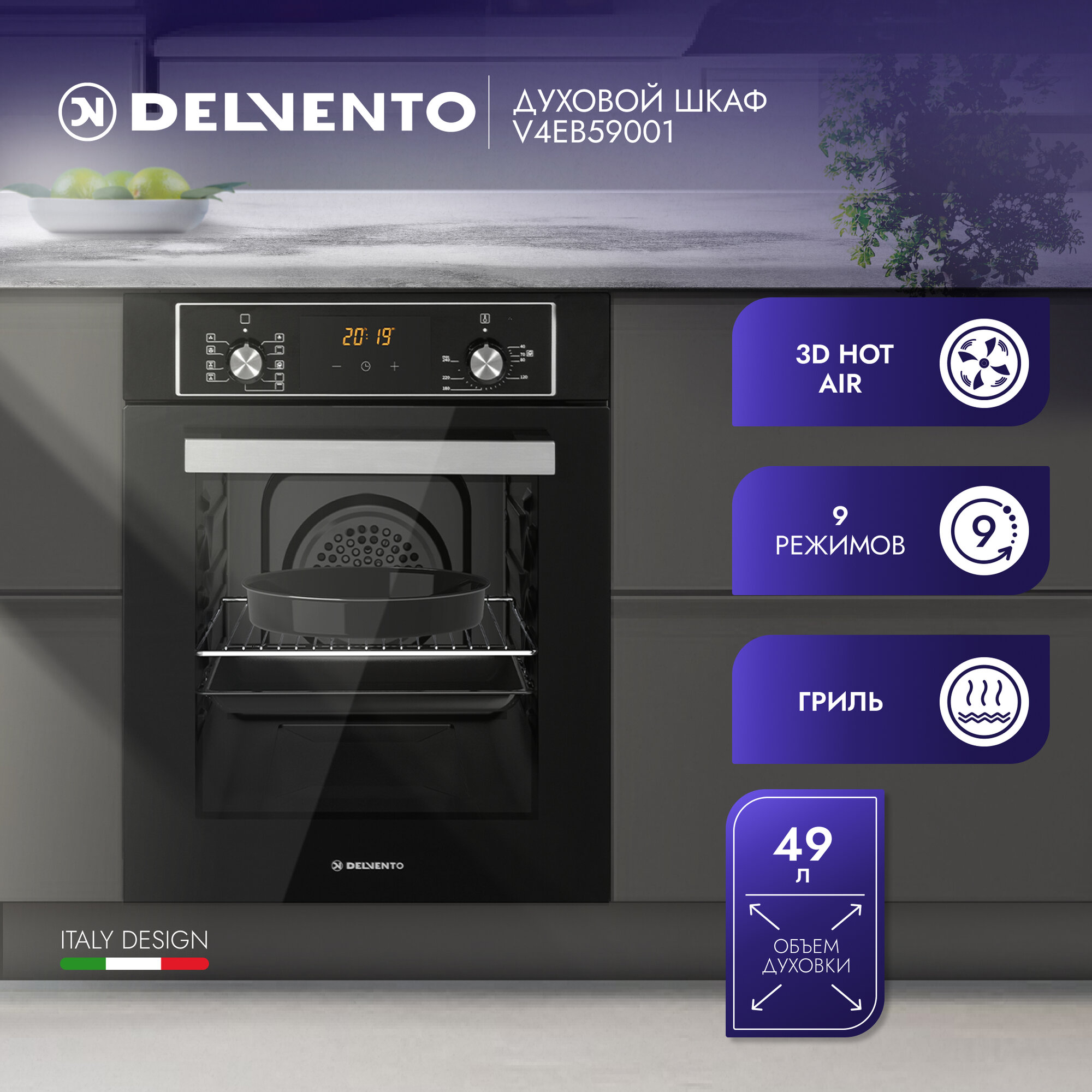 Купить Духовой шкаф электрический встраиваемый 45см черный / 9 режимов (гриль + конвекция) / DELVENTO V4EB59001 / дисплей / таймер 90 мин, часы / двойное стекло LOW-E / хром. решетка и 2 противня: стандартный + круглый / подсветка / гарантия 3 года /