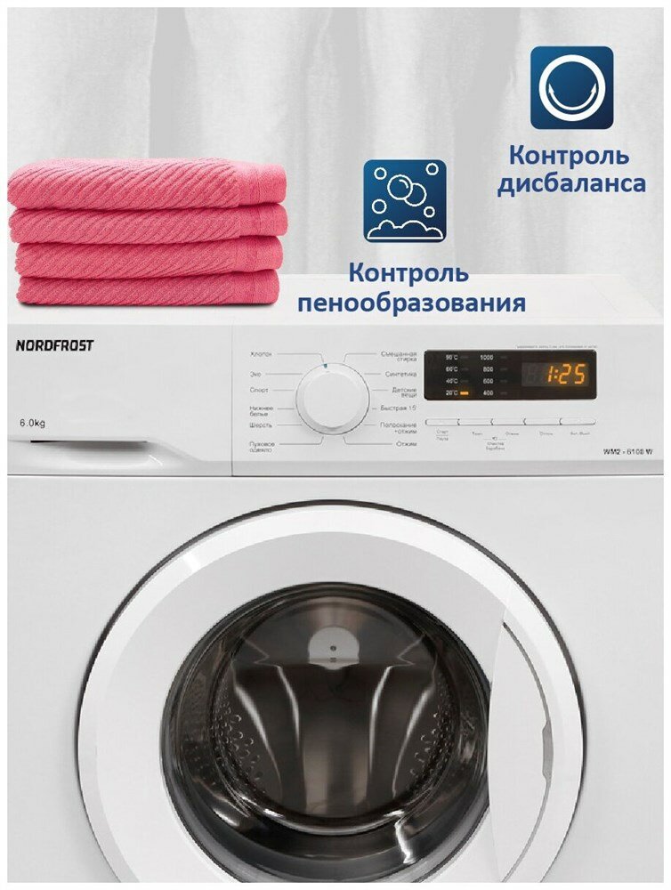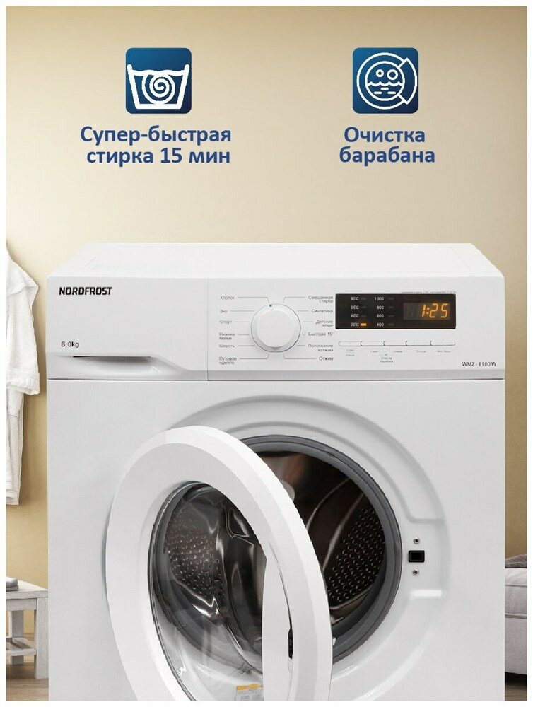 Стиральная машина NORDFROST WM2 6100 W, 6 кг загрузка, 1000об/мин,12 программ, отсрочка старта, быстрая стирка, LED-дисплей, цвет белый интересное: